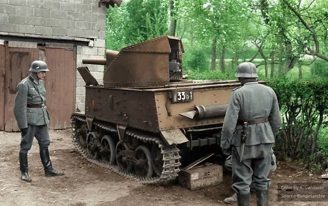 In the morning of the 21st May 1940, tank 814 commanded by Lieutenant Schreiber is hit and the whole crew were killed. Tank 803 is also disabled by a number of hits from German PaK 37 anti-tank guns. The tank commander, W Verboven, and gunner Delens are instantly killed. The driver Goossens manages to survive the incident. On the 22nd May 1940 the remaining tanks are withdrawn behind the River Leie at Zwevezele for a short rest.