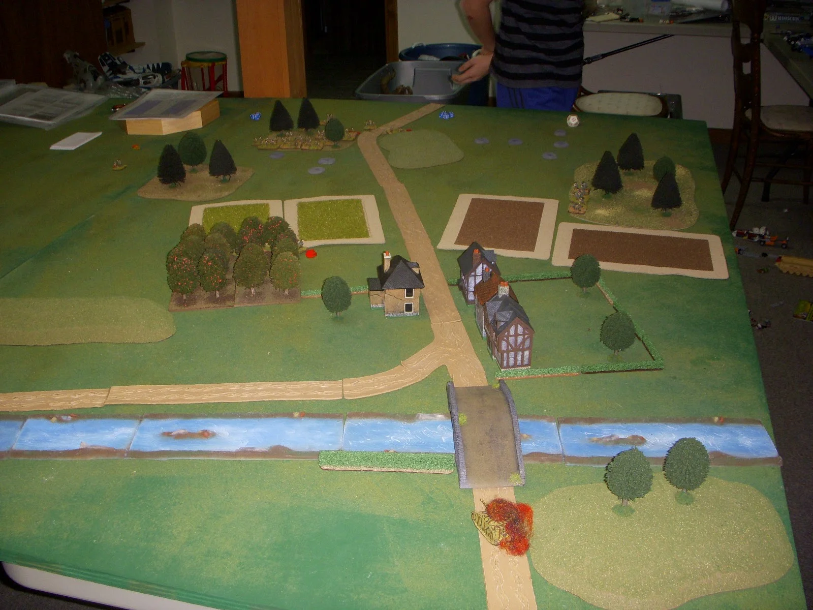 I placed a German platoon with two machineguns in a hidden defense. Set the stage for the US commander (my son) to bring on his rifle company in column of platoons. He had intel that a STUG had been knocked out by the air force (just a threat to make him worry about tanks) and that the scouts had recieved mortar fire (shell holes in the open to warn him to stay in cover).