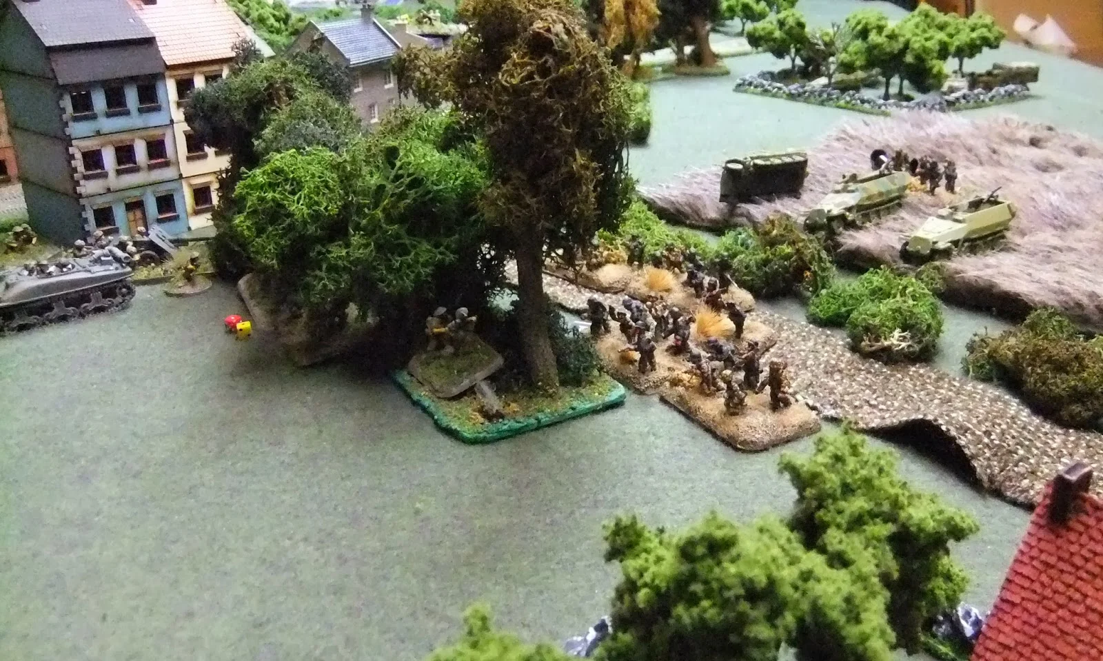 His entire platoon opened up. The Hanomag on the left was caught in a cross fire from the houses and took a glancing hit from the AT gun that tore up it's right hand track. It's engine started smoking and a few Germans bailed out dragging wounded comrades with them into the shelter of the crops. The other two halftracks stopped and their sections of Grenadiers jumped over the sides to rush across the road covered by fire from the vehicle MGs.