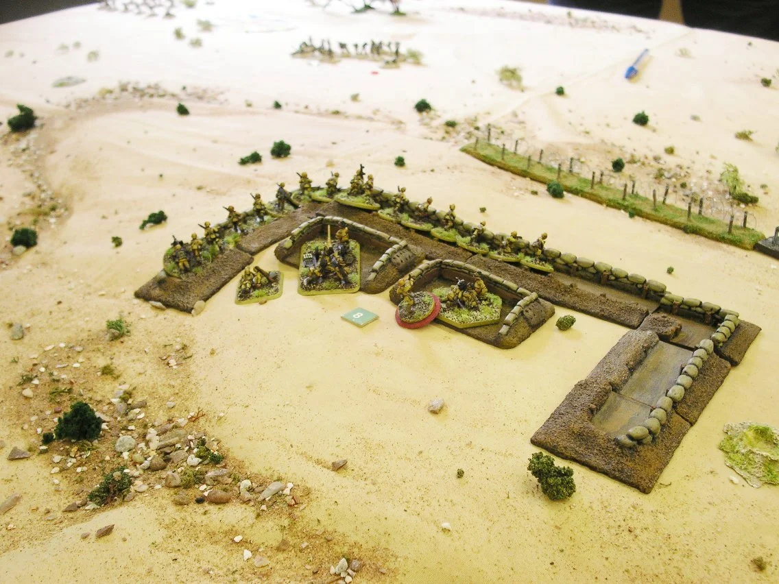 The British platoon advancing up the far end of the table, opposite Elton's position, was gradually obliterated, as was one of the platoons advancing towards my more central position. The other British platoon, and the company HQ, made it to the lee of the hill on which my trenches were placed, but then found they couldn't really go any further.