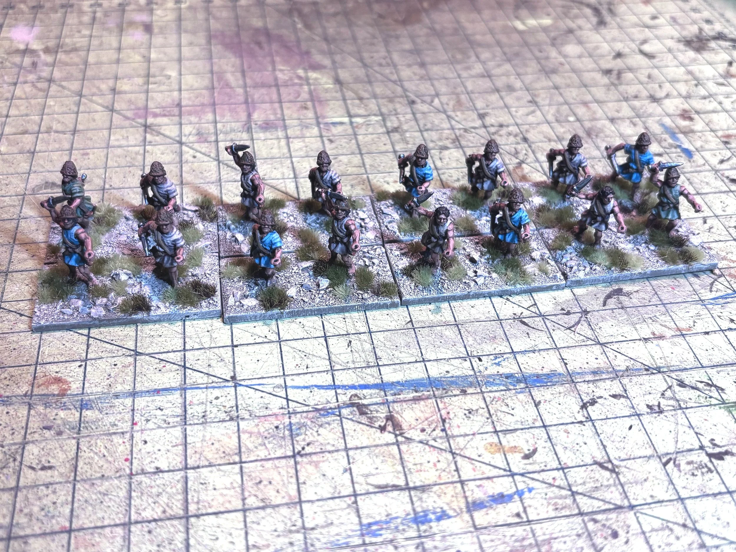 These were painted by a sprayed undercoat of Vallejo English Uniform, washed with GW Agrax Earthshade, then drybrushed and highlighted with Vallejo Khaki Grey.