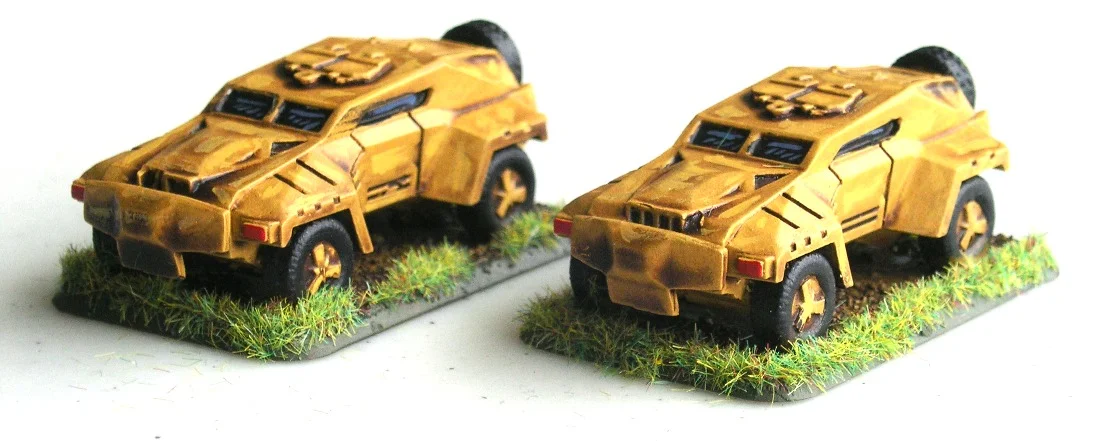 The Felids get a couple of, well, jeeps, I suppose, to help their Big Men get about. These vehicles are from the Antenocci's Workshop GOT 15mm range and paint up beautifully. Highly recommended.