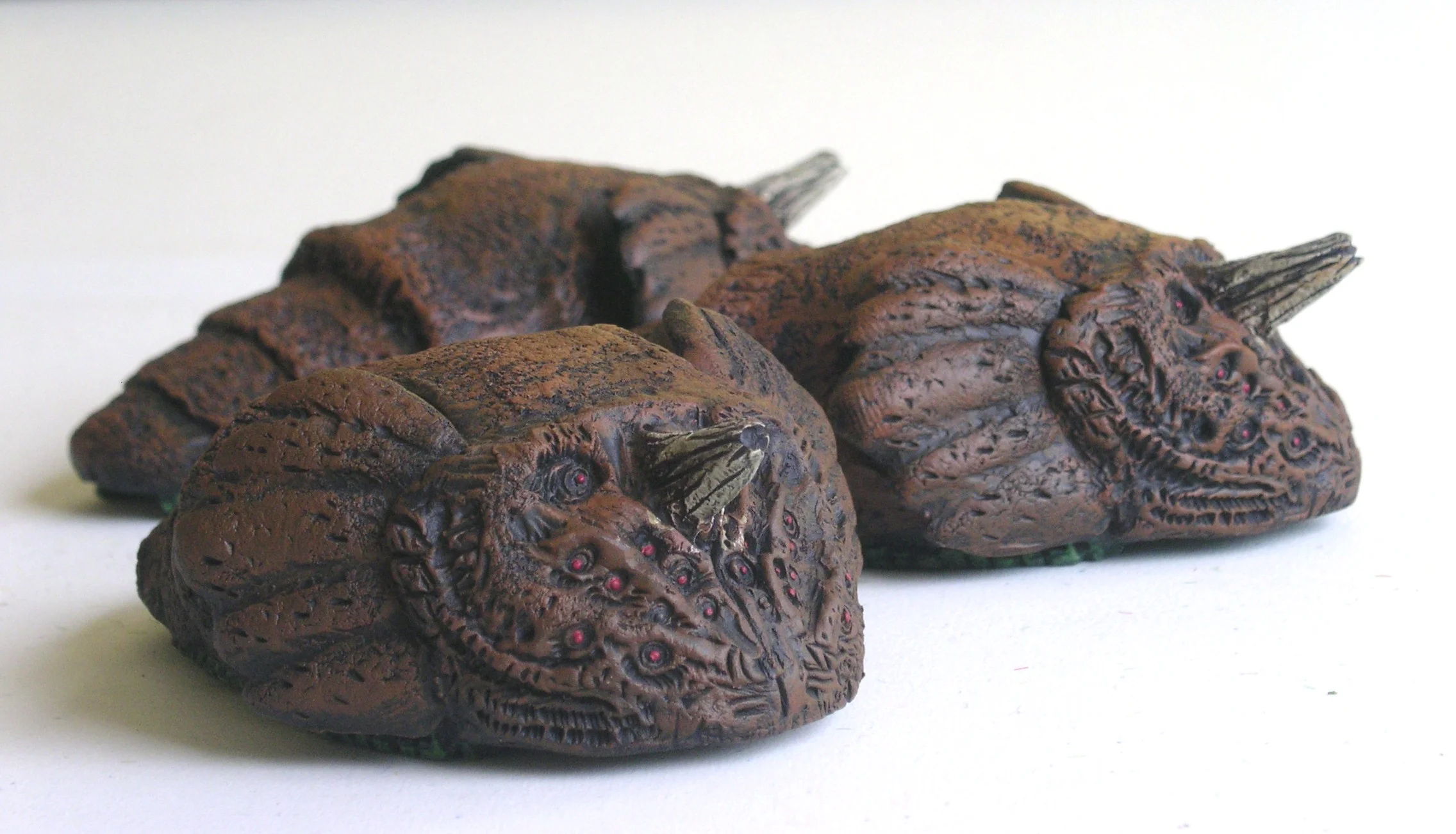These rather turd-like tanks from Ravenstar's Horrid range are actually minelayers: the flaps just behind their 'heads' can disgorge patches of larvae that, with Chrome, I have defined as being the equivalent of mines i.e. they attack any enemy men or machines that enter their ambit.