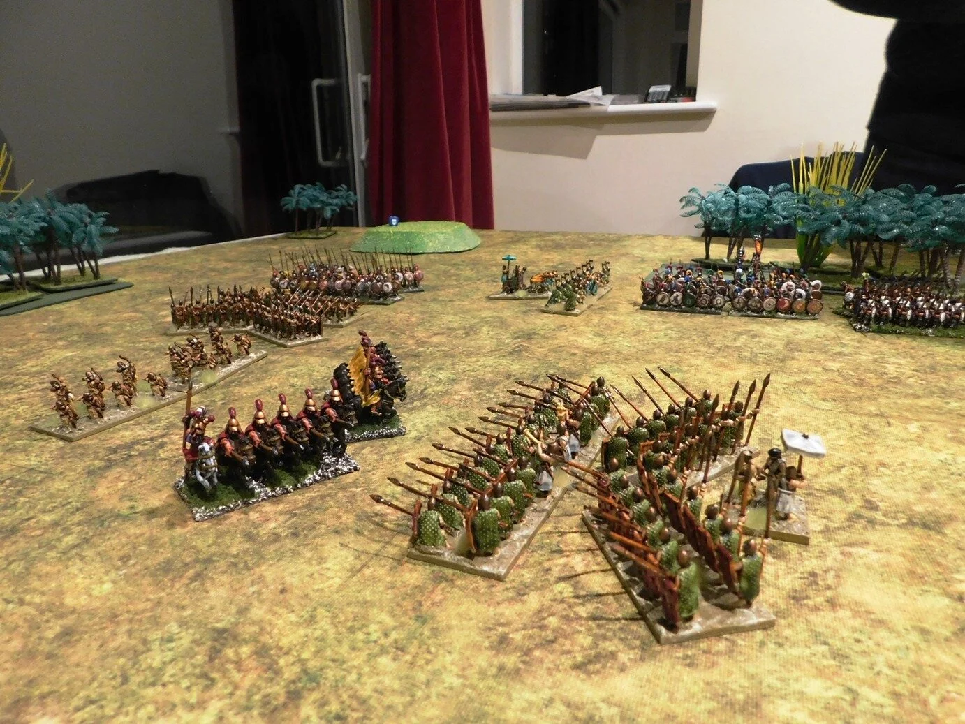 The Brits had a huge chunk of (somewhat unwieldy) warriors in the centre of the field, and large numbers of light chariots/cavalry and infantry on each wing…so many lights, in fact, that (much to Bevan’s surprise) his all-horse Sassanids were matched in terms of scouting points.