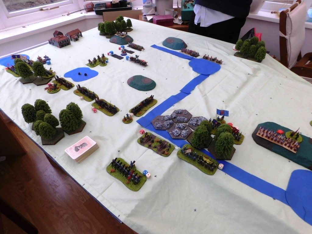 As his troops massed for further charges into my left flank, the battle was actually decided back on the right centre, where Bevan’s remaining infantry unit had retreated back from its firefight with some of my Registered Cossacks in order to re-group.