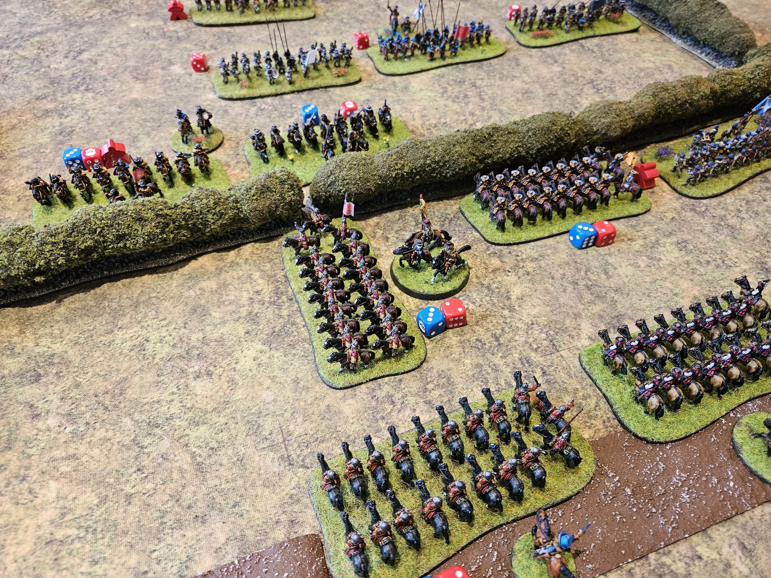The Royalist had managed to sneak a horse unit around onto the Roundhead flank, using it very effectively to dash some Dutch Horse from the field. This gave the Cavaliers the impetus they needed to push the Parliamentarians back from the hedge, following up to take the battle into open ground. Unfortunately for the Royalists, however, the Roundhead horse then generally rallied and began to fight back.