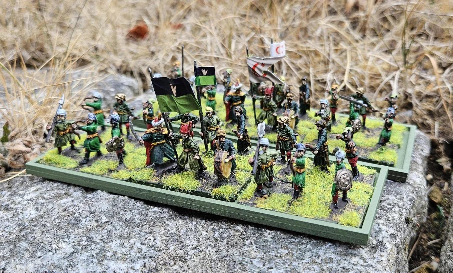 Note that one base has got a couple of non-Khurasan hussars that I had lying around from when I had previously bought a unit of hussars from Instant Armies (recommended as a source of painted figures: always look out for them at shows).