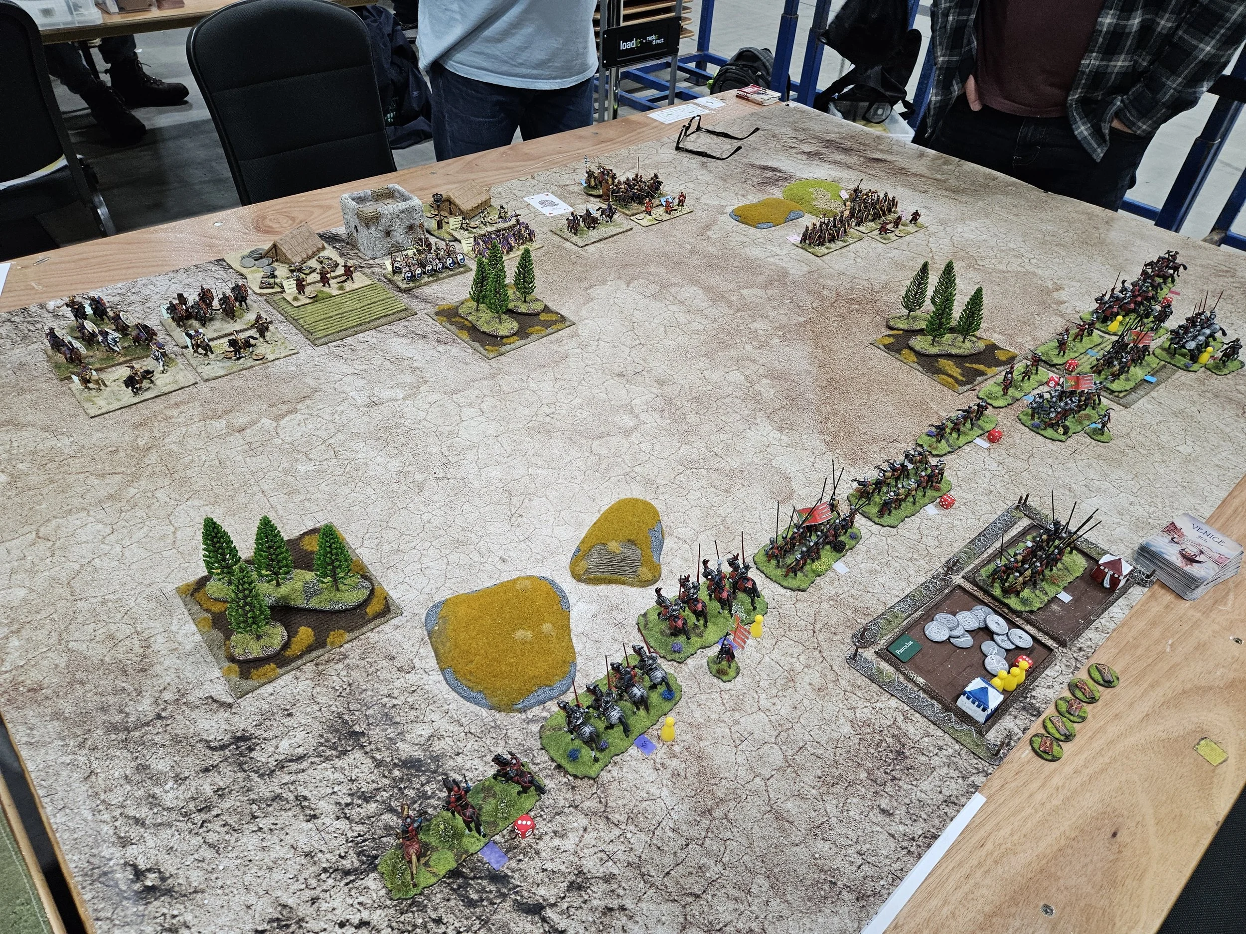 Si slammed his right-centre (facing my left) forward, and I was soon facing a major assault across my left-centre that I only managed to withstand with the help of the Knights from the left that, had I not withdrawn them, would have been stuck embroiled with Si’s veteran light cavalry somewhere up on the far left side of the table.