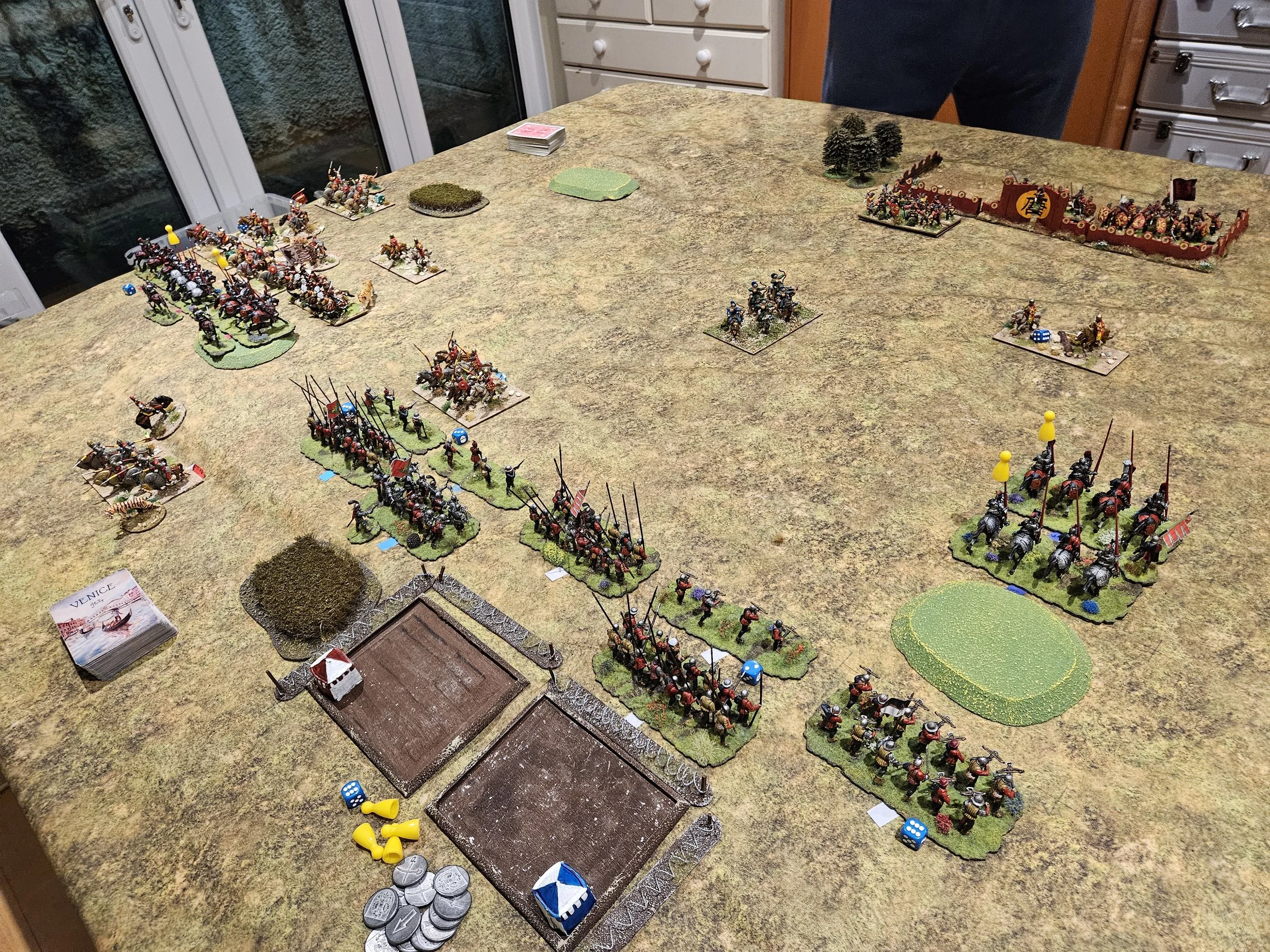 The right hand knights finally got moving, and the infantry Alabardiers, with the aid of the handgunners, cut through some enemy lancers to dominate the centre of the field.