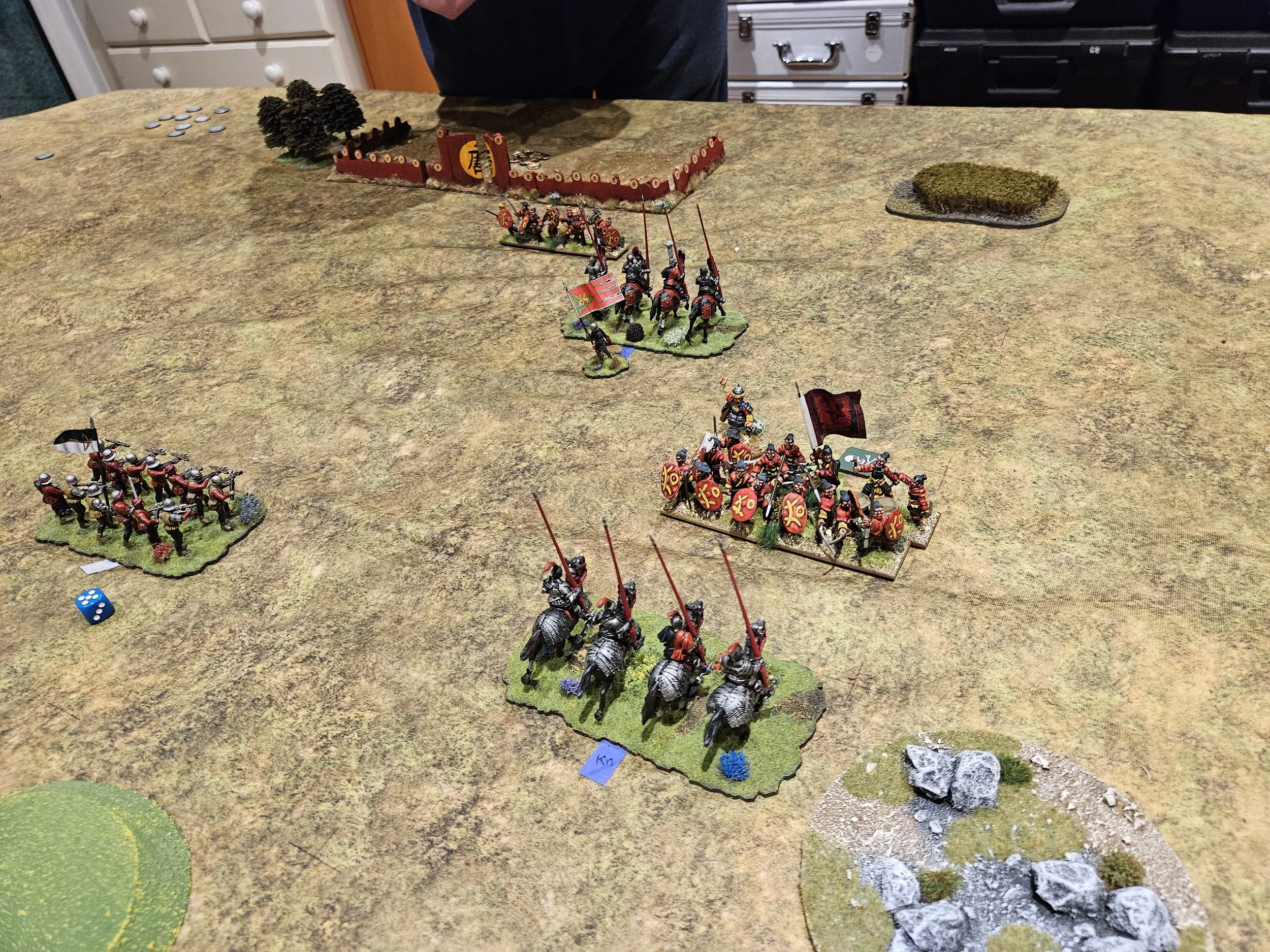 The toher thing that needs to happen to defend against Peter’s favourite tactics is for the Knighst facing the main thrust to hold their ground as, if they go, the successful Chinese cavalry units will flood sideways into the flank of my main line.