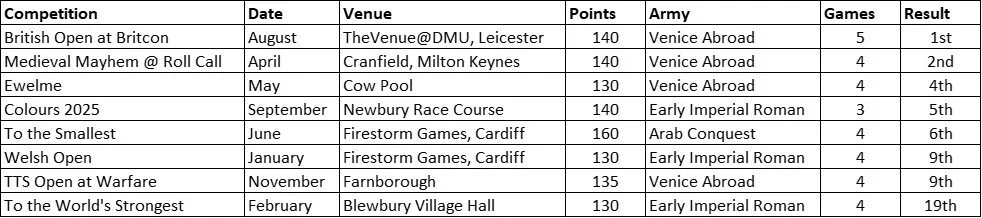 A light showing on the show front in 2025, and even those were mostly connected to tournament play. I missed out on Salute and both Partisan shows, but did manage Roll Call, Overlord, Warfare, Colours and Vanquish.