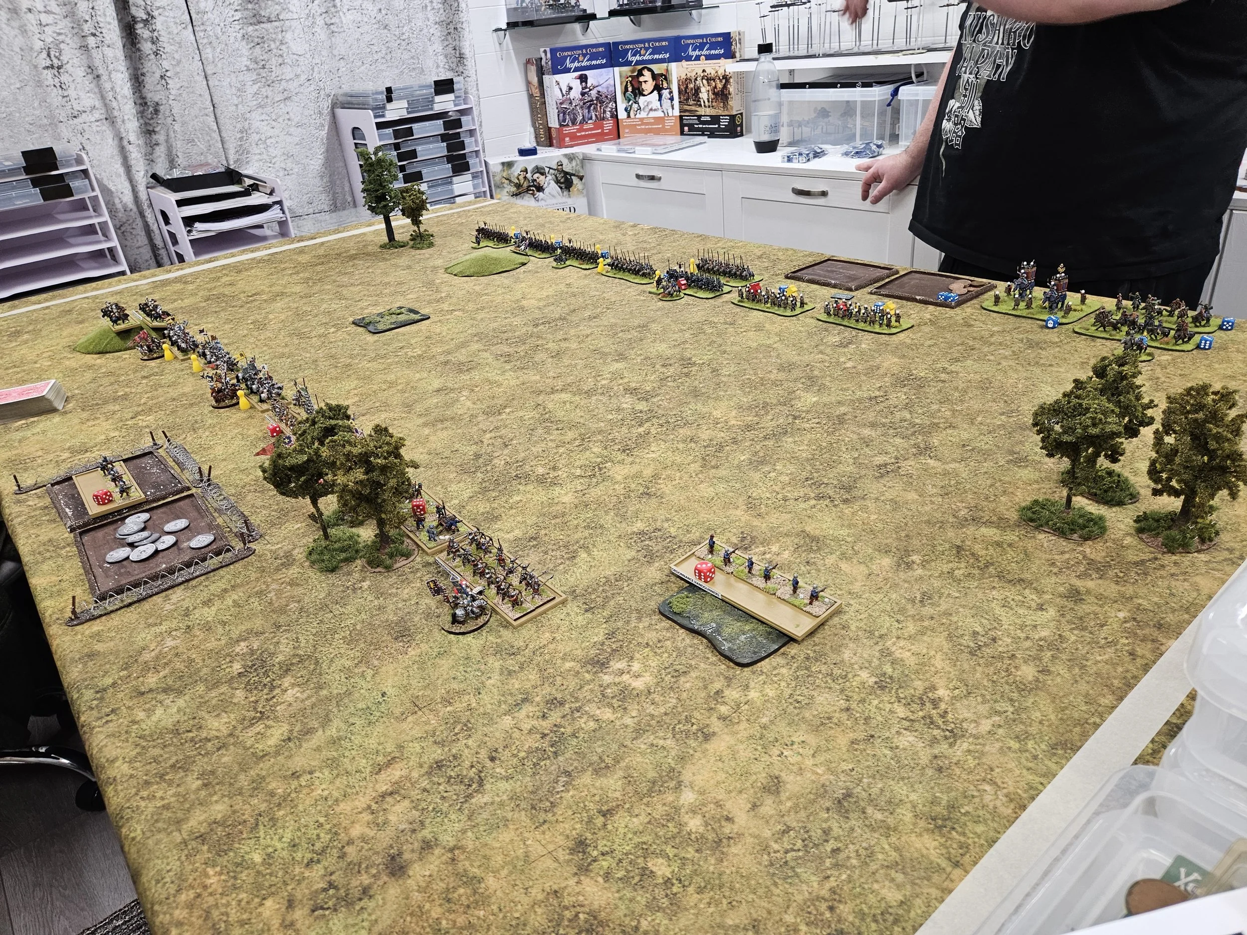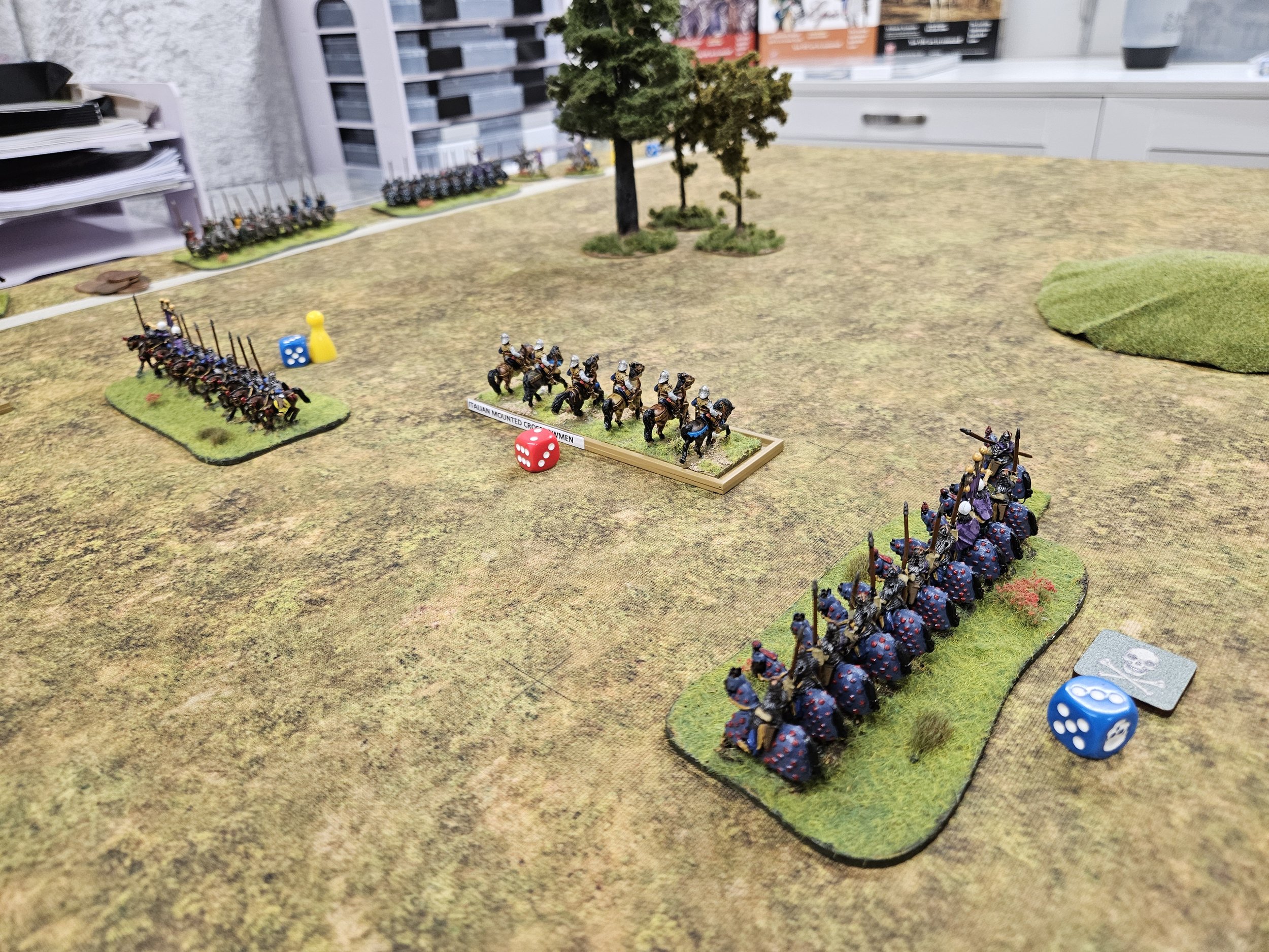 All this meant that I had to weaken my right, so I used the This Way Effendi! strategem card to push back his infantry and horse-archers there, and placed the Ducal Household Infantry supported by handgunners and an organ gun to cover them.
