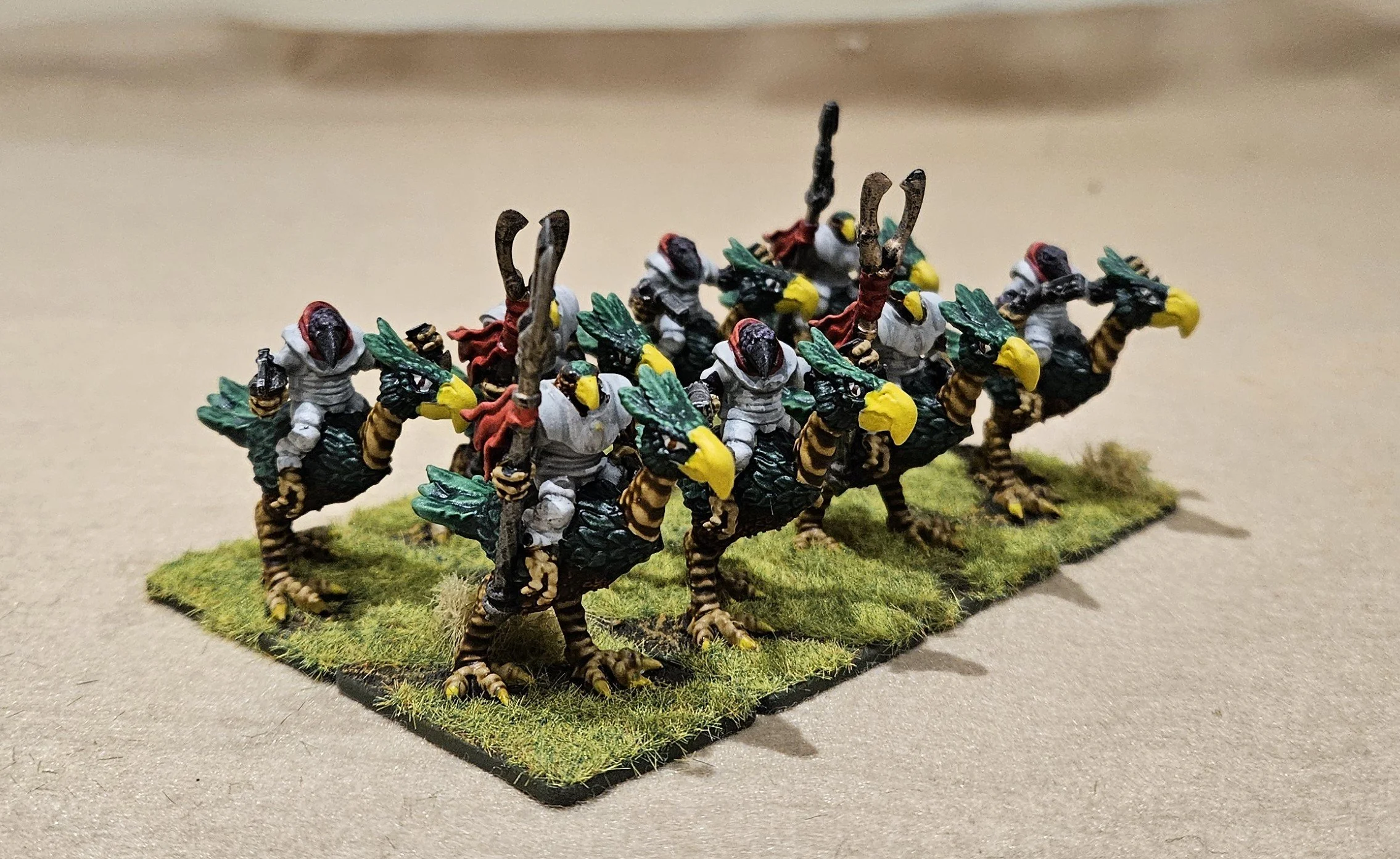 First off the Trilaterum Avian production line was a squad of mixed cavalry: (Haliaeetus) Hauk and Corvids mounted on Casuarius flightless birds.