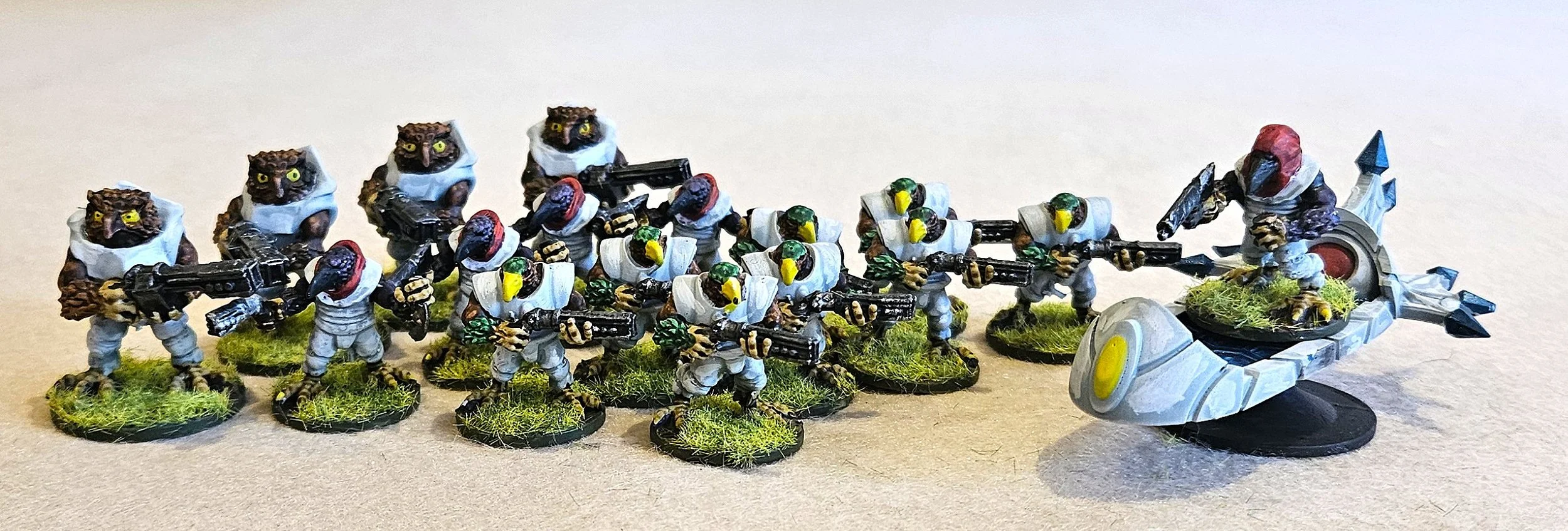 The Avians from Trilaterum divide into three different races. First up, we’ve seen the lookalike Hauk on warbirds, here are the infantry versions, who really are remarkably like Khurasan’s Hauk, albeit a lot larger. Next we have the Corus (I’ve renamed them Corvids in my lists) who look like crows. Finally, the Virginianus (should that be Virginianii?) who are best described as giant owlmen! There’s also a sky sled: some kind of hover or antigrav vehicle.