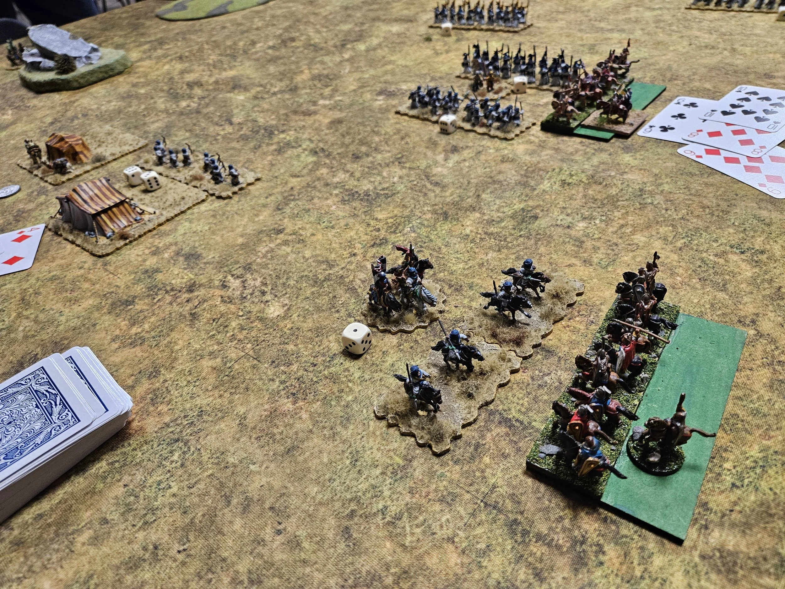 On the left, Geoff’s three cavalry units made mincemeat of my more numerous Arabs, and I soon found myself down half my coins and very much unable to contemplate any kind of outflanking manoeuvre there.