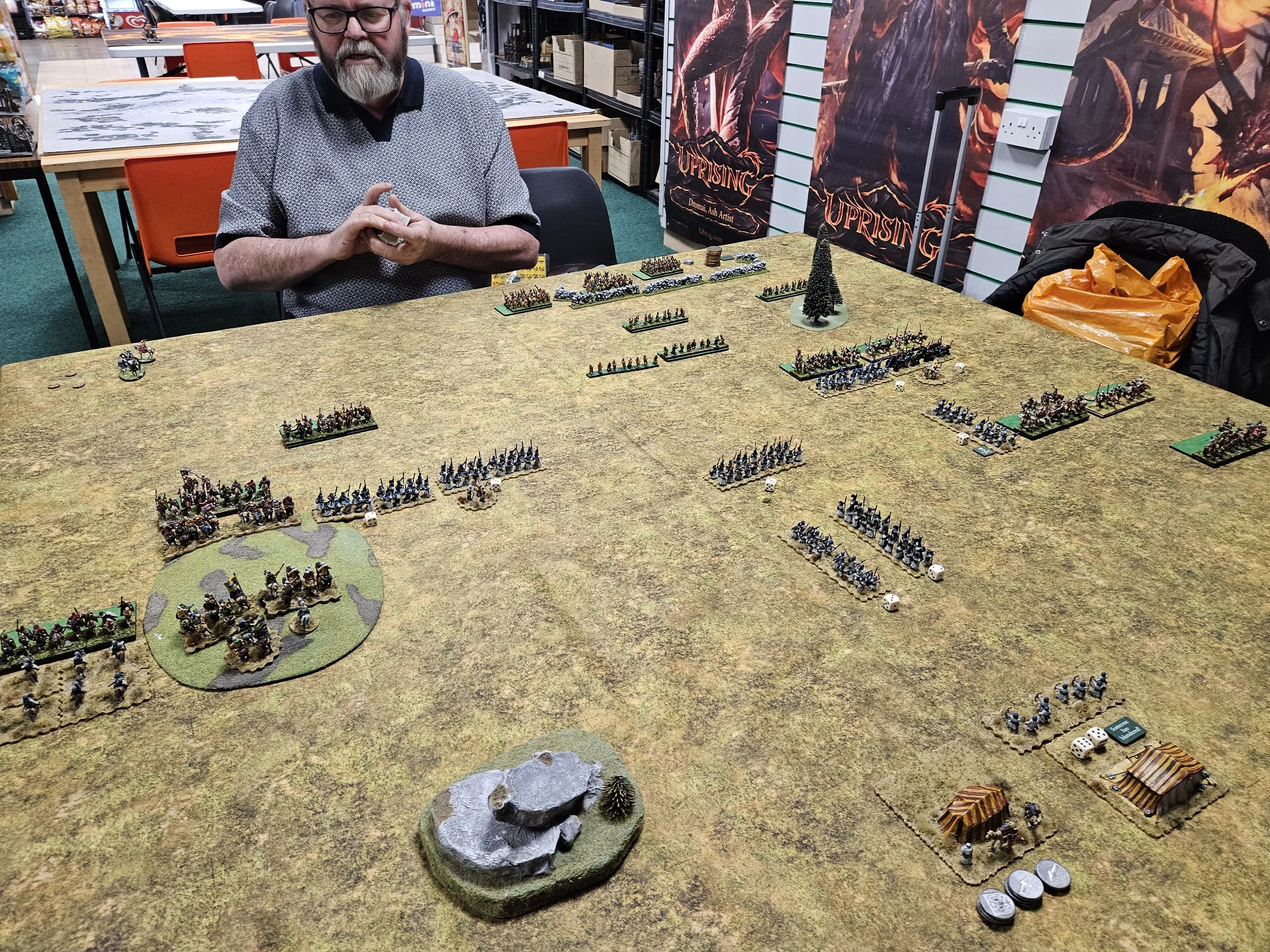 The death of the bowmen let the enemy cavalry through onto my flank and, despite the fact that the Black Guard had some success to their front, it was only a matter of time before I lost my last few coins and the battle…helped by the cards letting Geoff’s final attack go in.