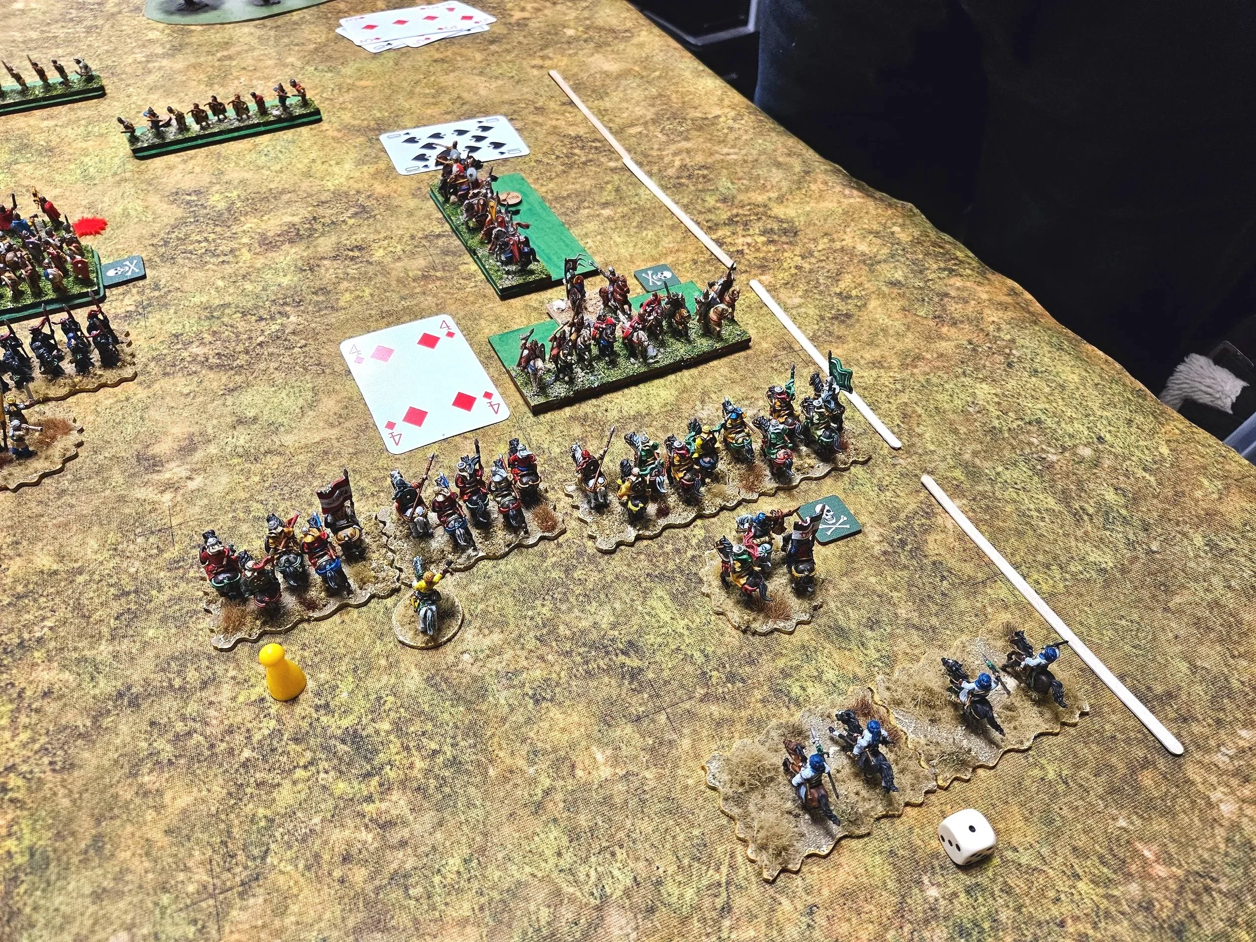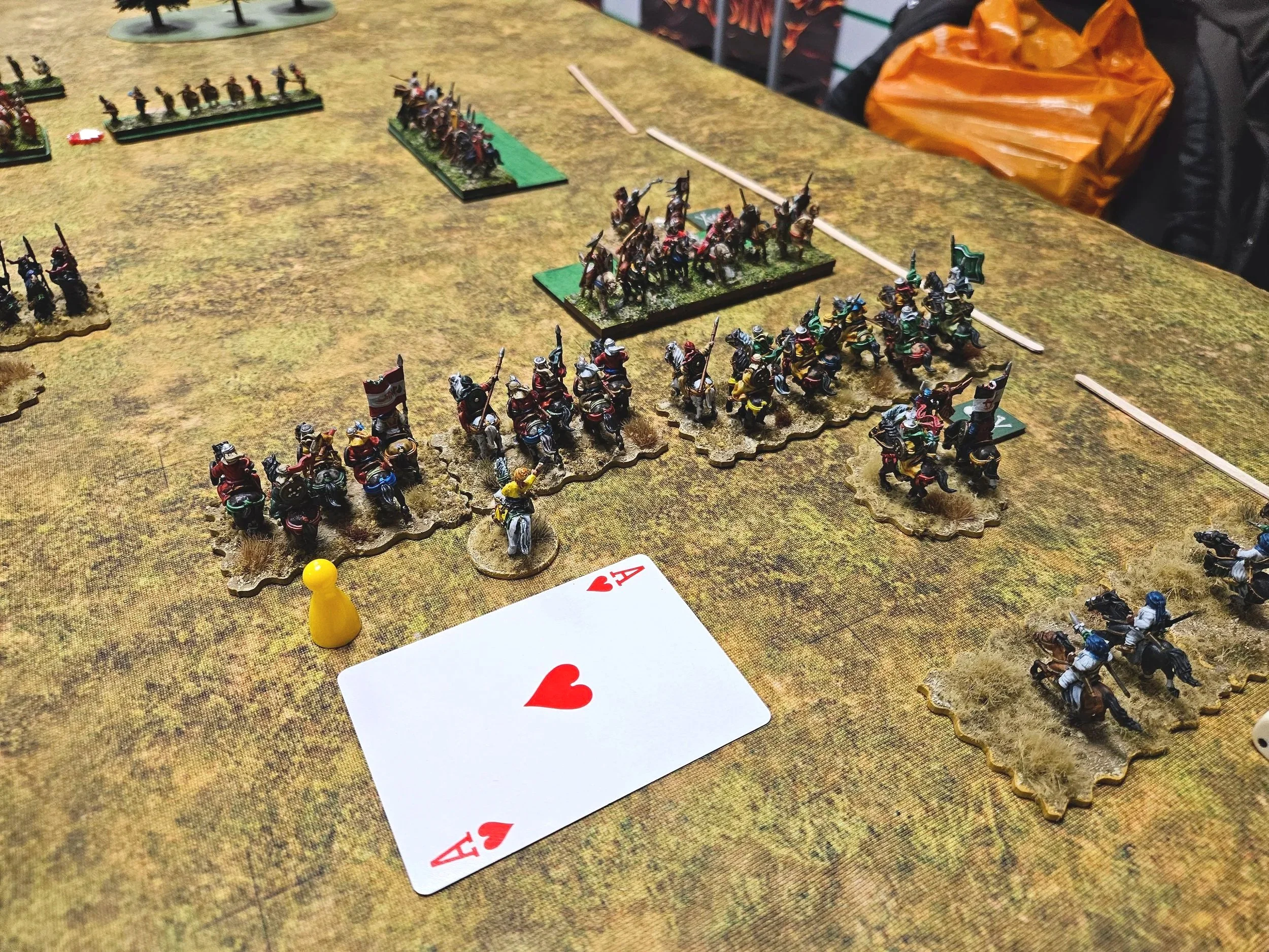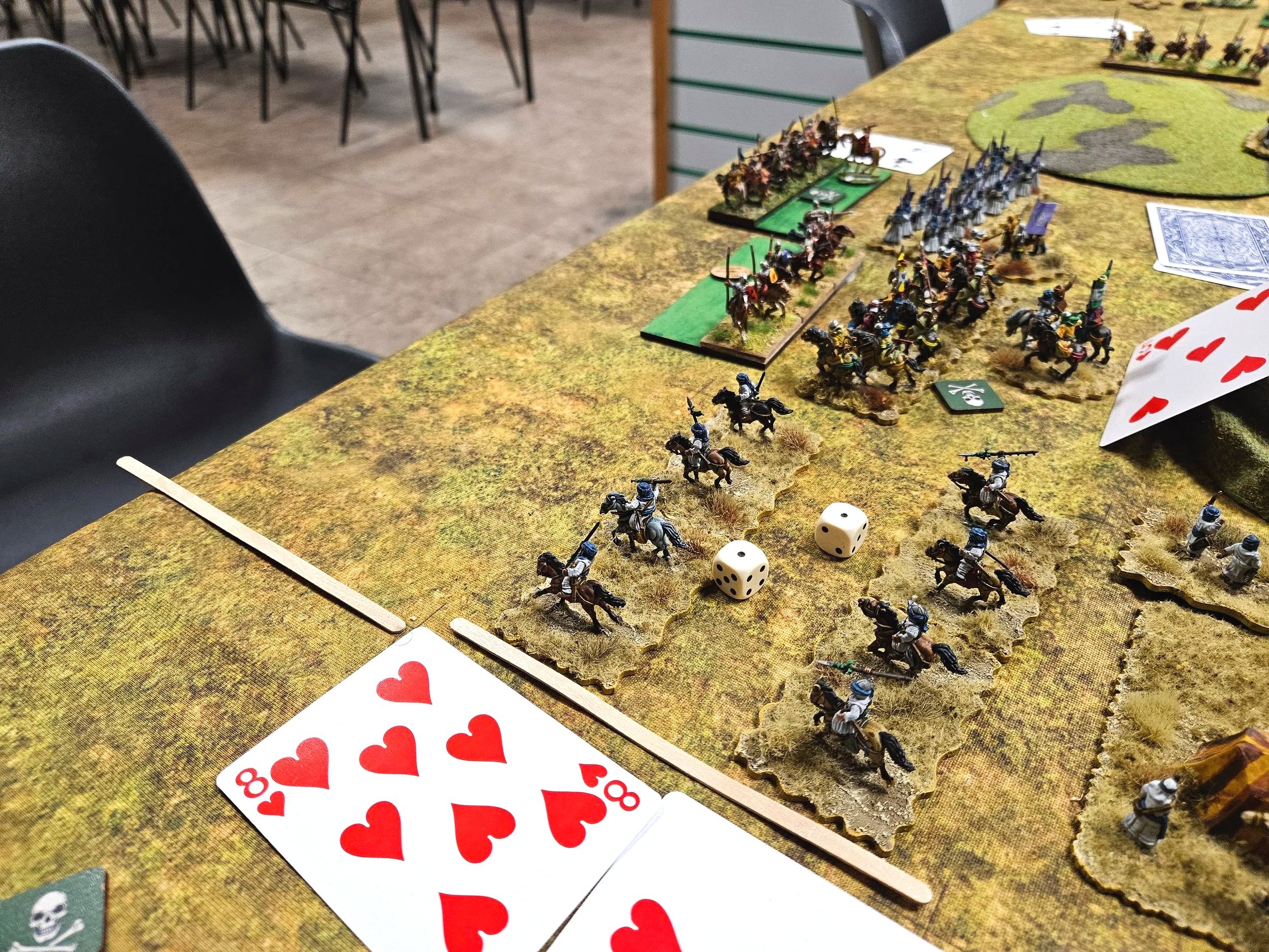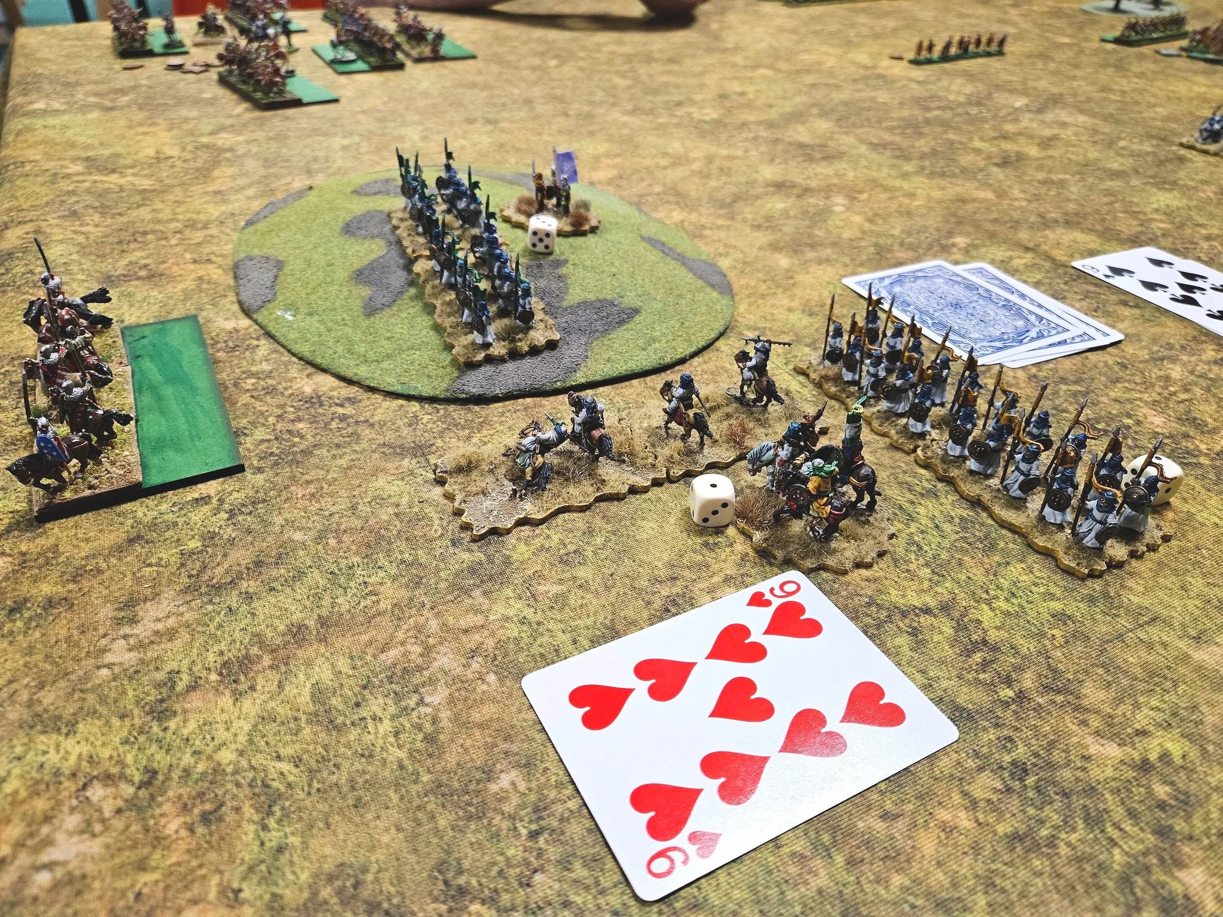 As it happens, I did get it wrong, and his cavalry entered the table just behind the melee that was already going on (it’s the unit with the Nine of Spades next to it).