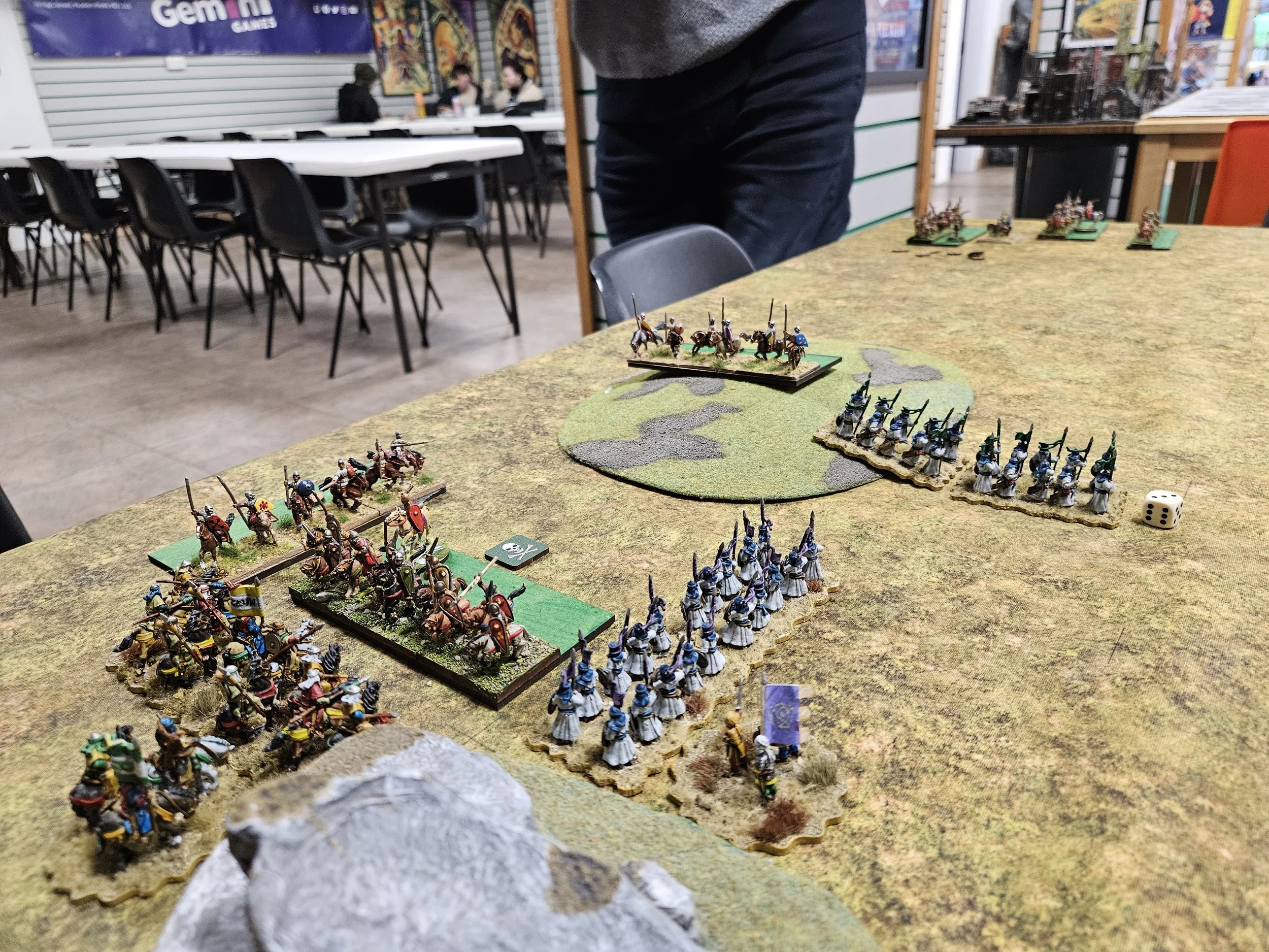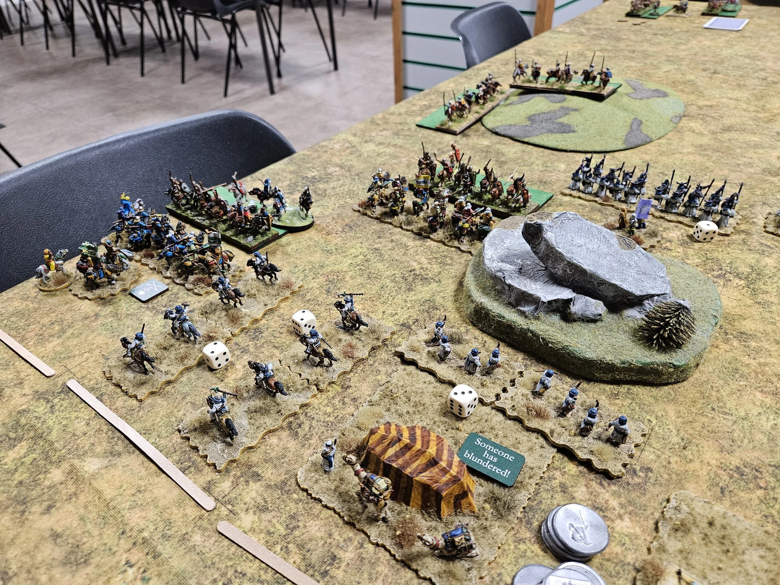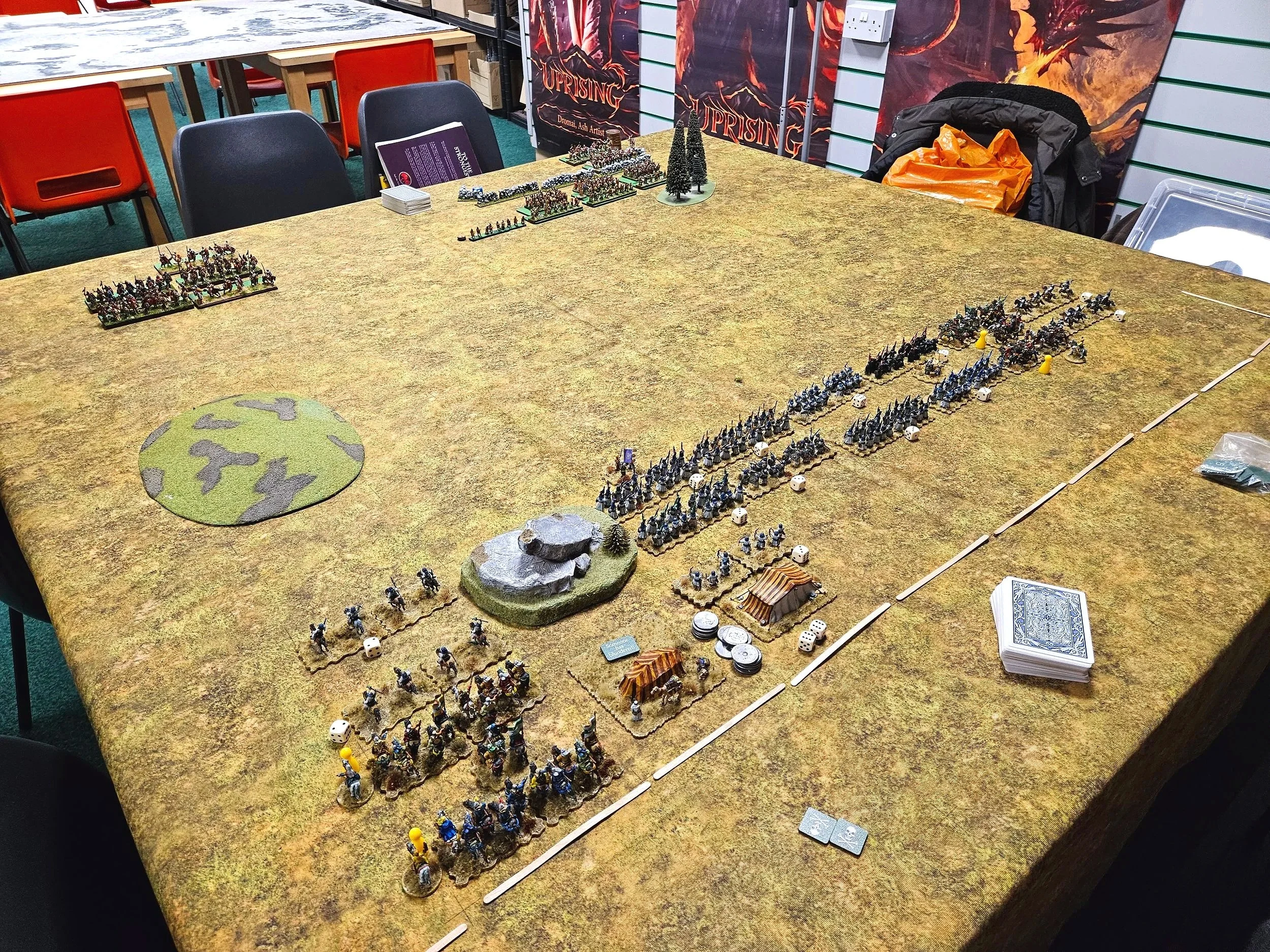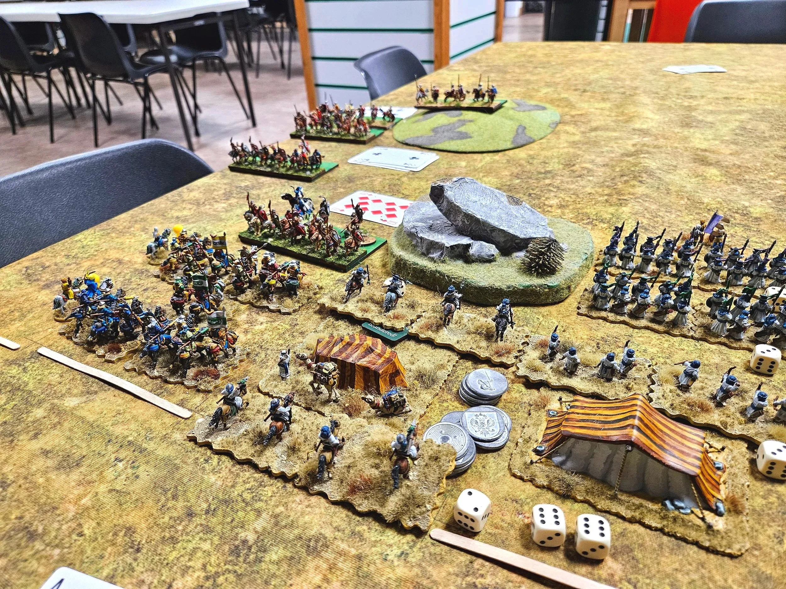 As it happens, I did get it wrong, and his cavalry entered the table just behind the melee that was already going on (it’s the unit with the Nine of Spades next to it).