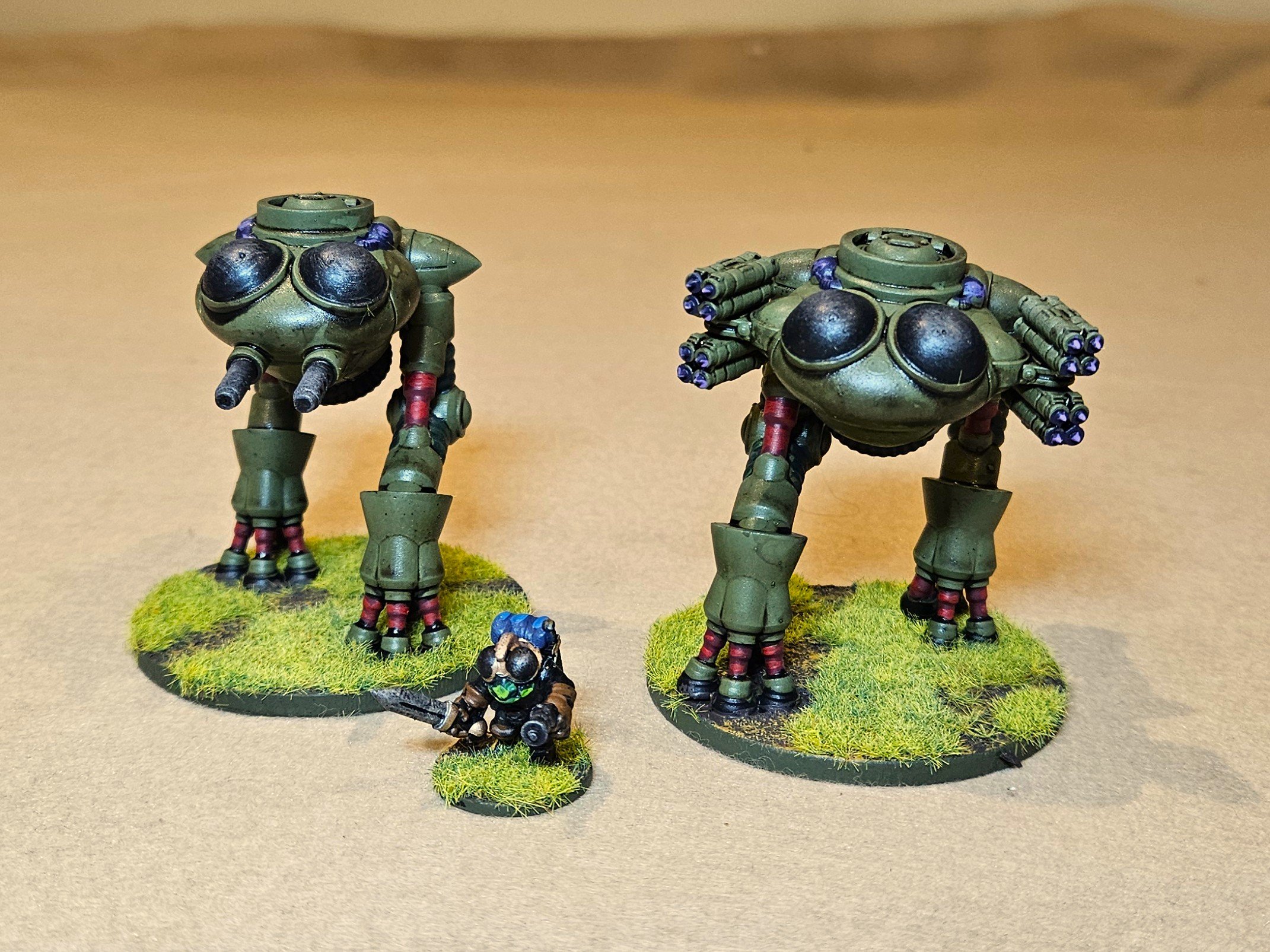 Along with 14 leg infantry, there’s a very cute APC, pictured above, and two different walkers, pictured below. I’m loving these: they fit right in with the rest of the Aphids. And they paint up beautifully as well: spray a lightish green, wash, highlight various bits.