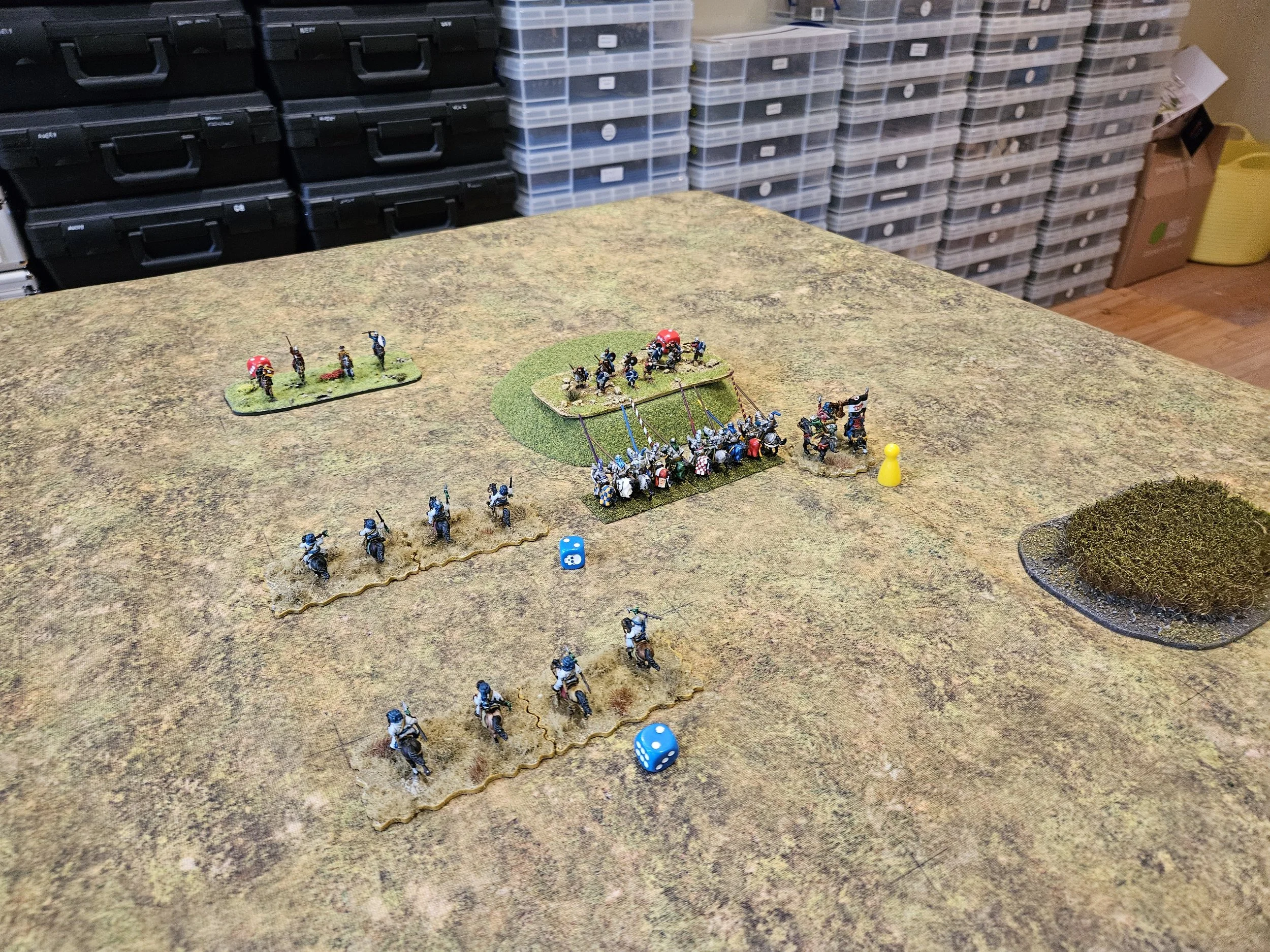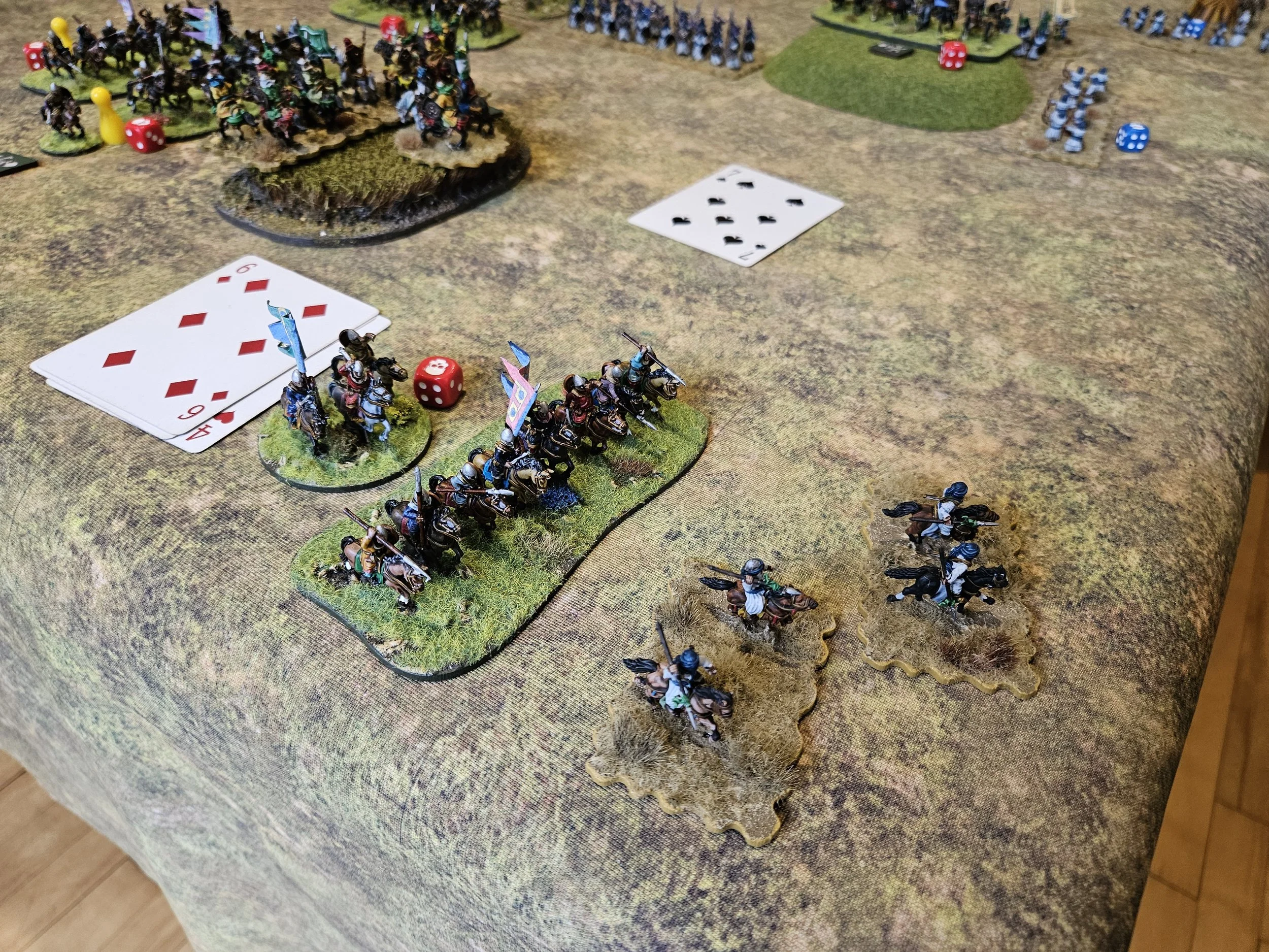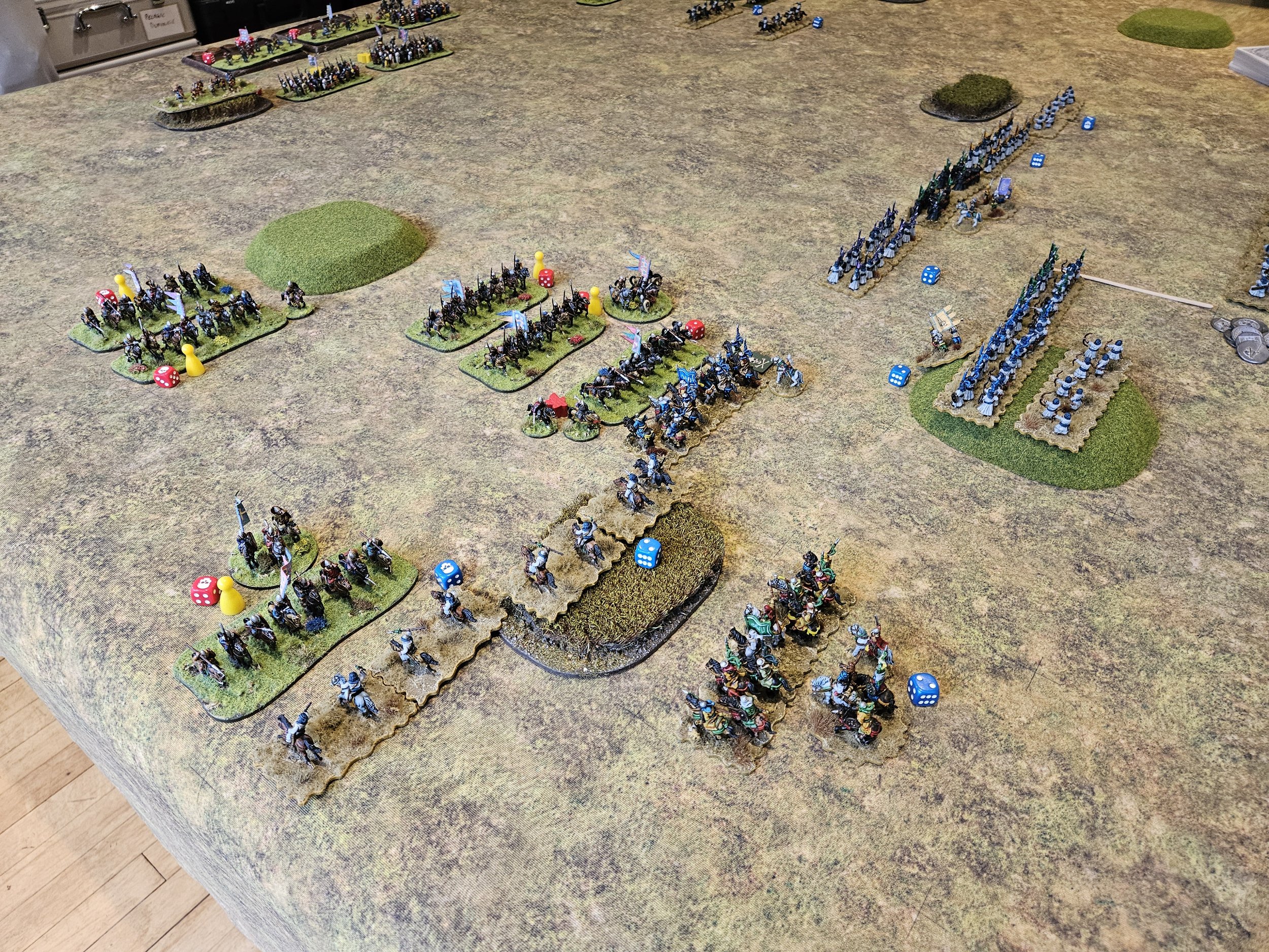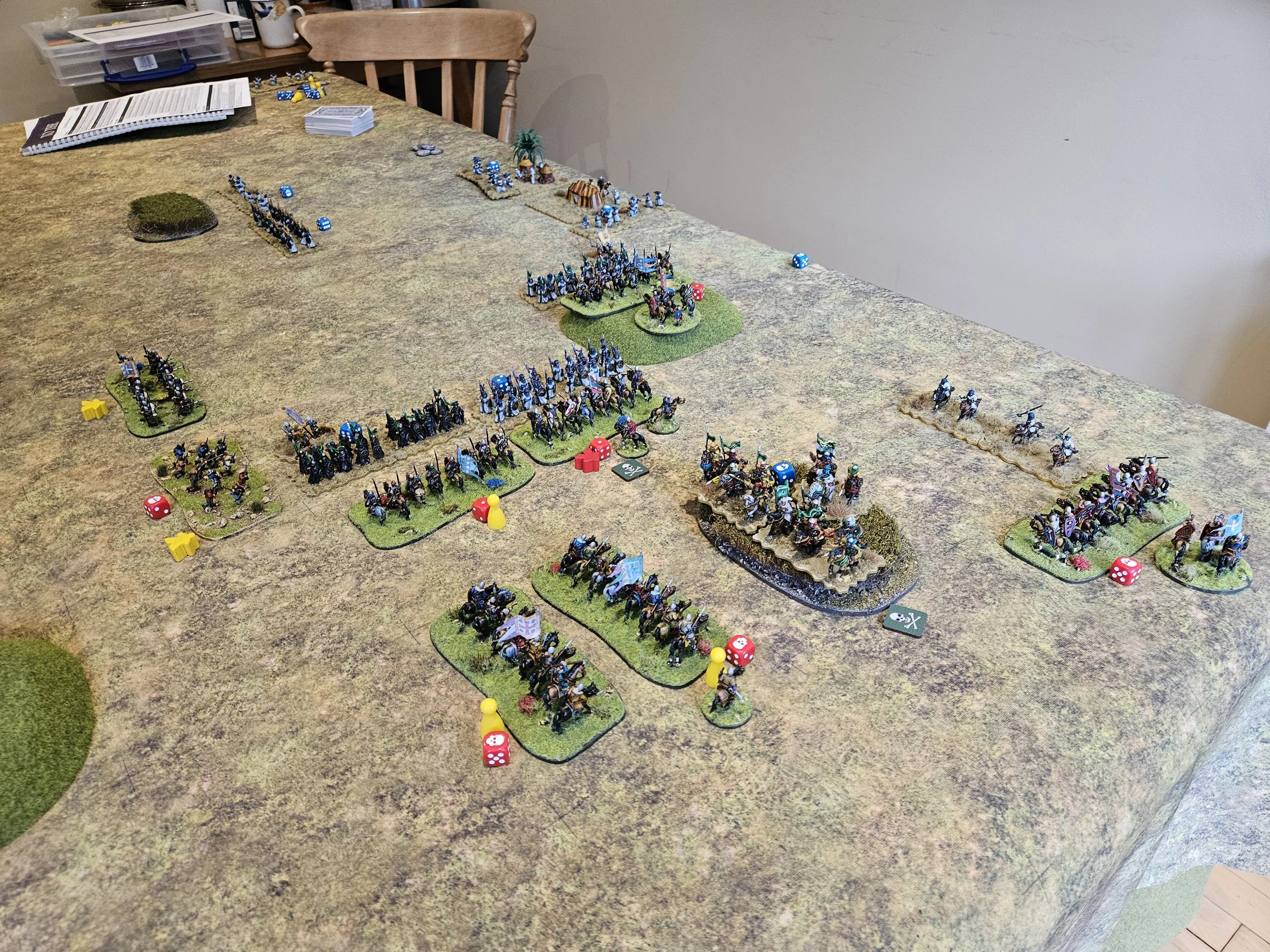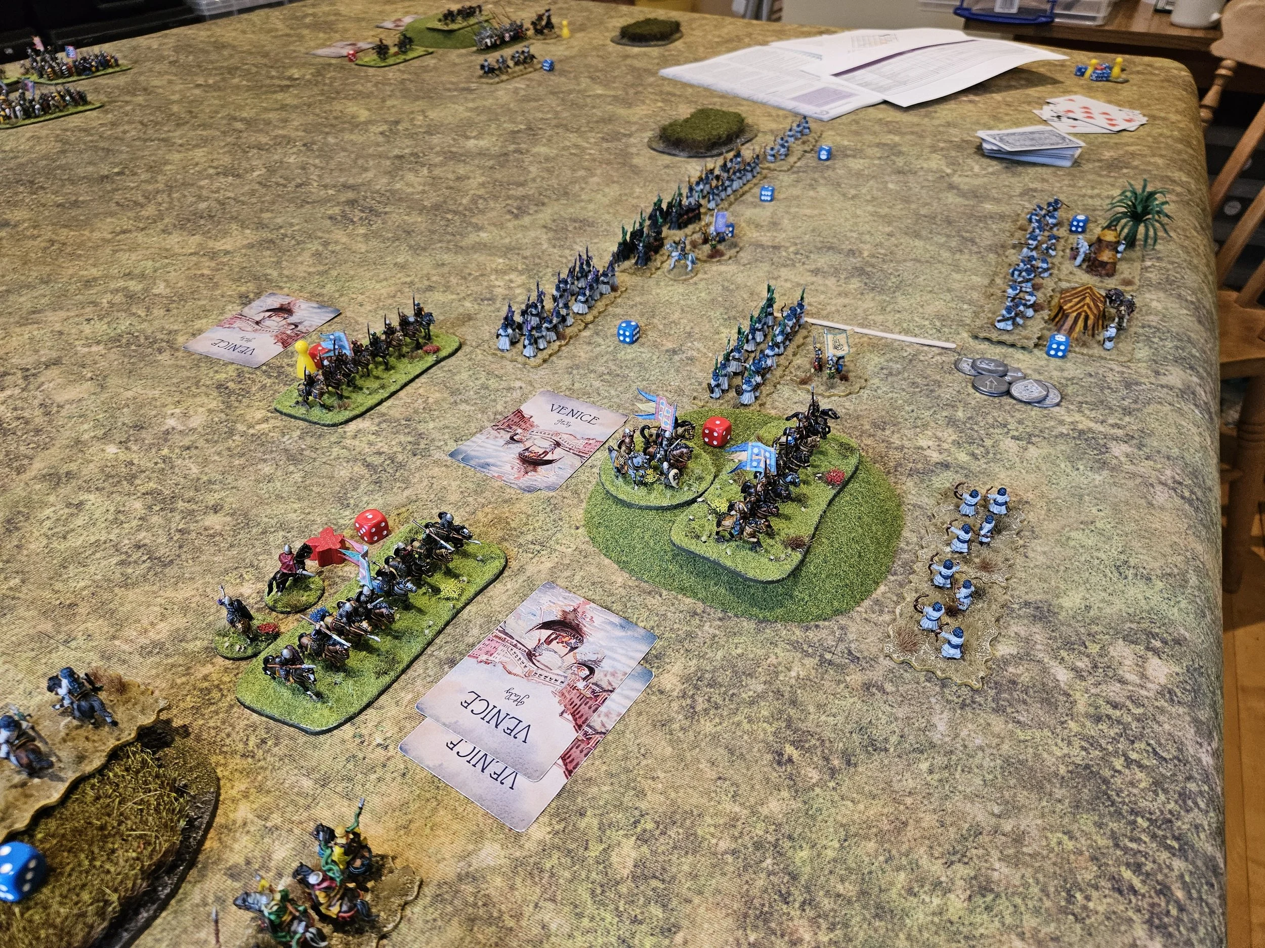 Despite these teething troubles, battle was soon well and truly joined on the left, with superior numbers of Christian horse generally mullering the Arabs until almost half my coins had gone and I was forced to bring infantry over from the centre to help.