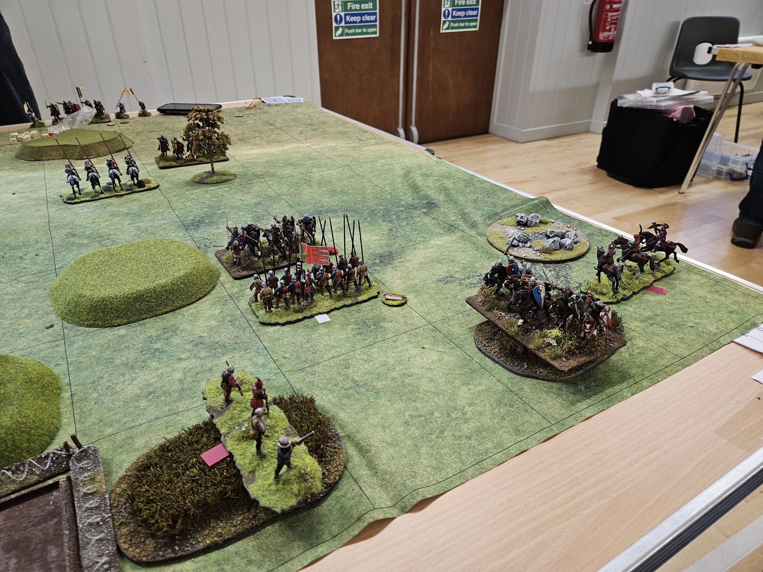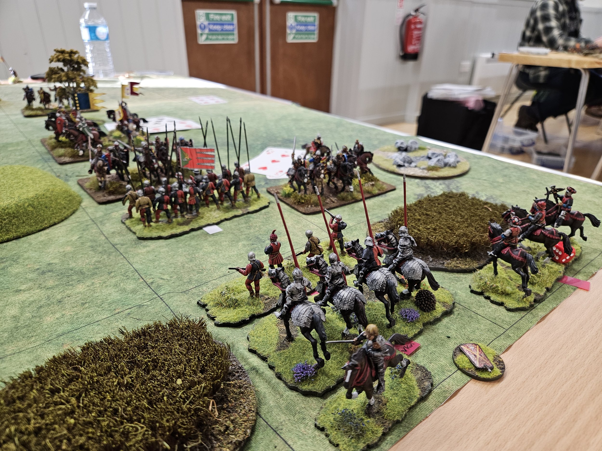 The game began,, and I was almost immediaely in trouble on not one but both wings: my Knights having dressed, as is often the case, in their ceremonial cardboard armour instead of the proper metal kit!
