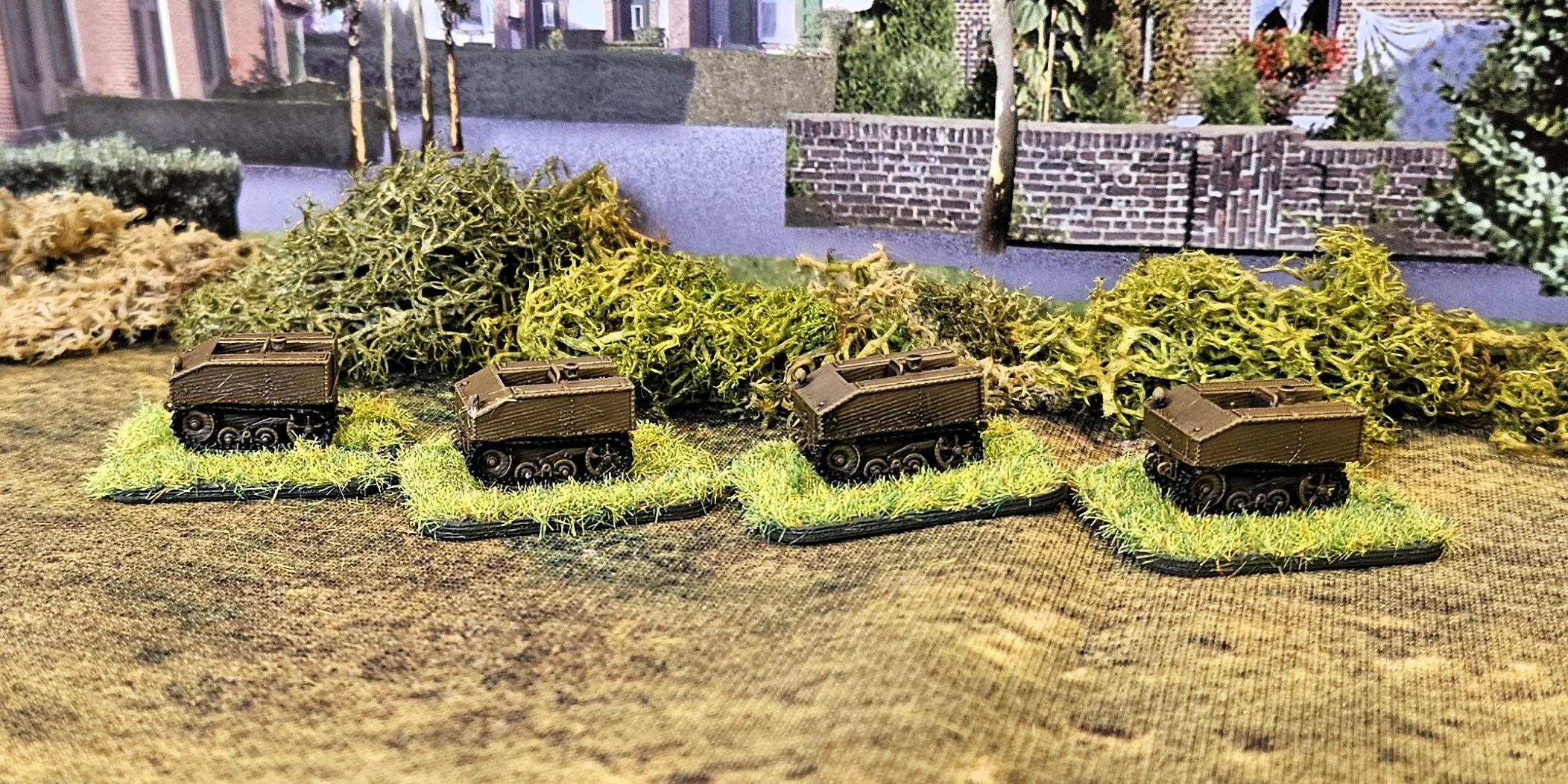 These were painted by a sprayed undercoat of Vallejo English Uniform, washed with GW Agrax Earthshade, then drybrushed and highlighted with Vallejo Khaki Grey.