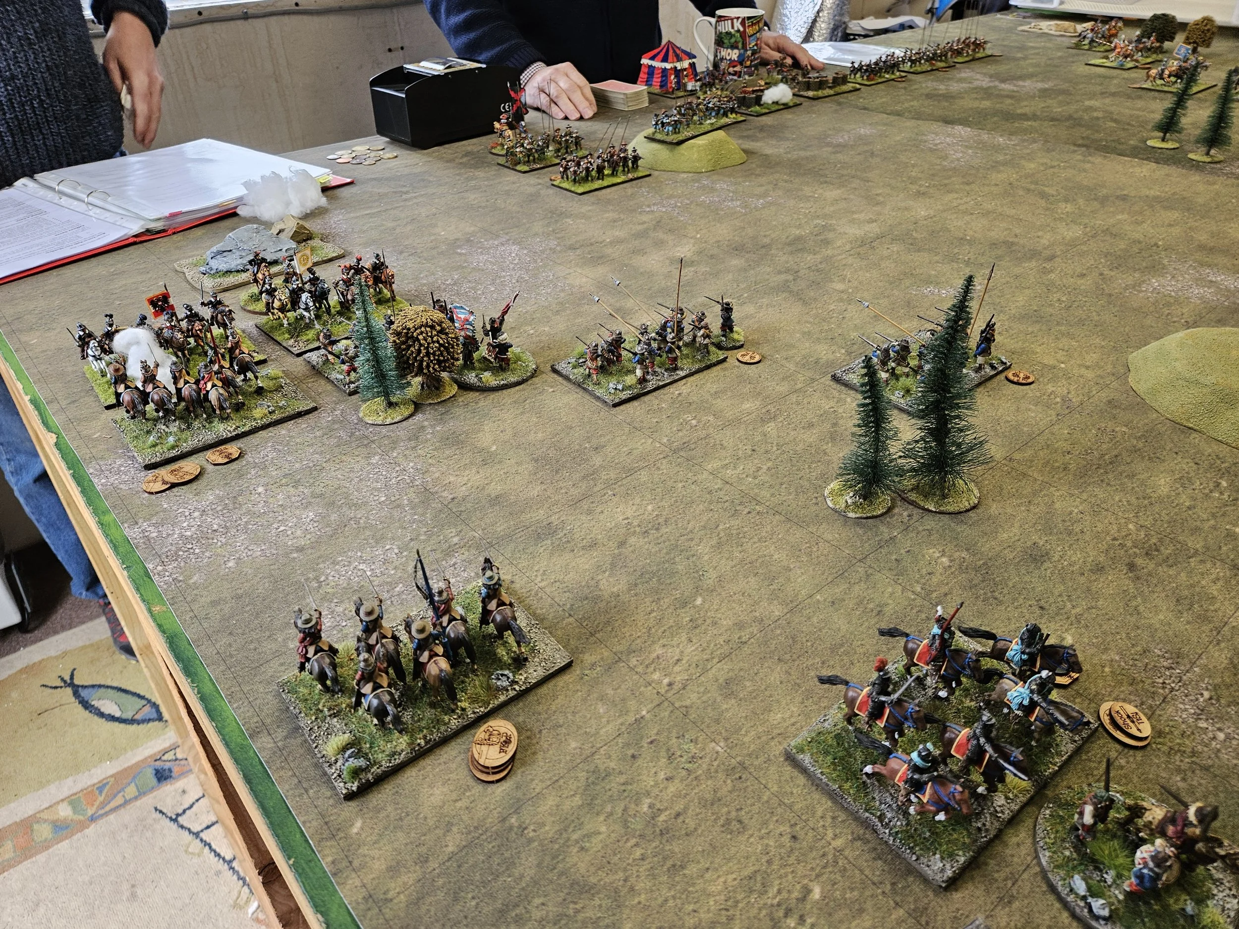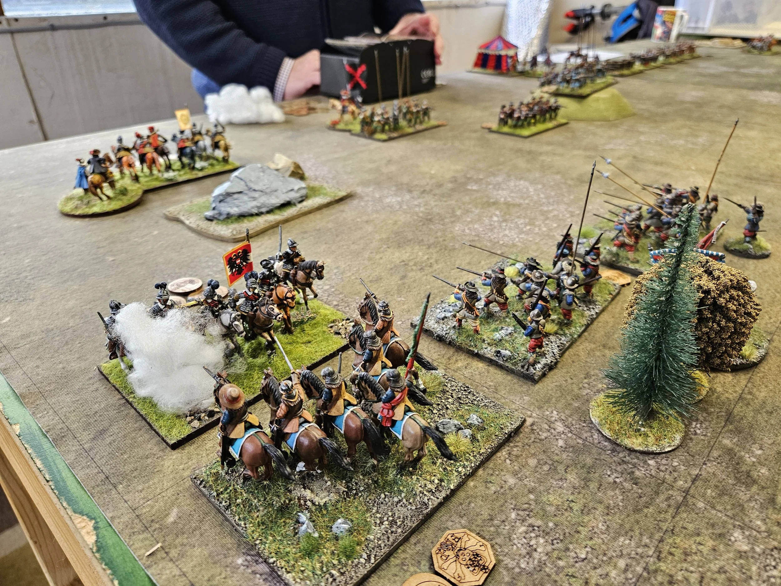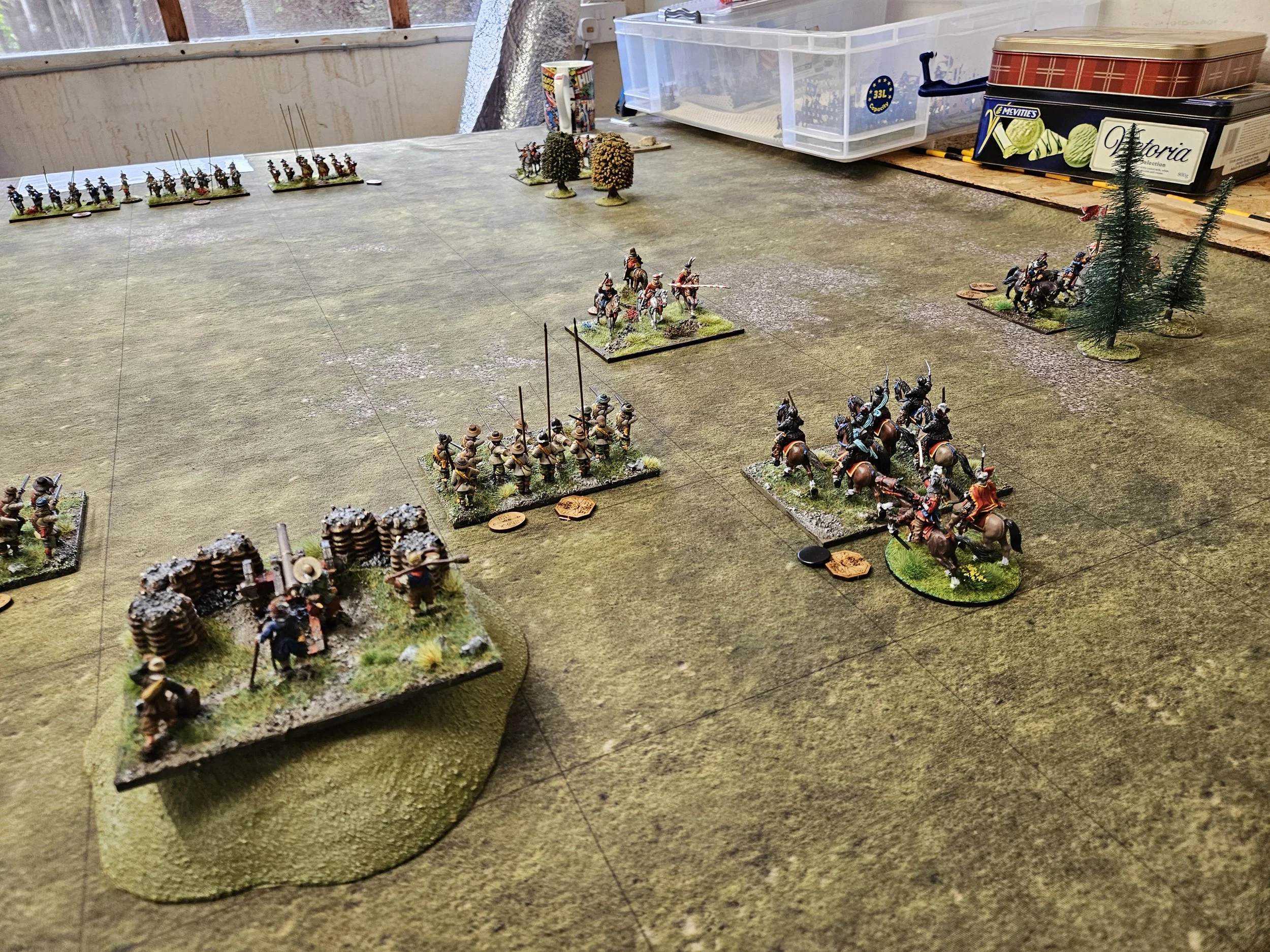 Back to the left where, unfortunately, I was discovering that the cards I had borrowed from Si were not happy about being so casually passed around, and decided to punish me accordingly: my brilliant plan, designed to pit five lethal fighting units against three units of horse with pistols, foundered on one of the worst runs of cards I’ve ever seen.