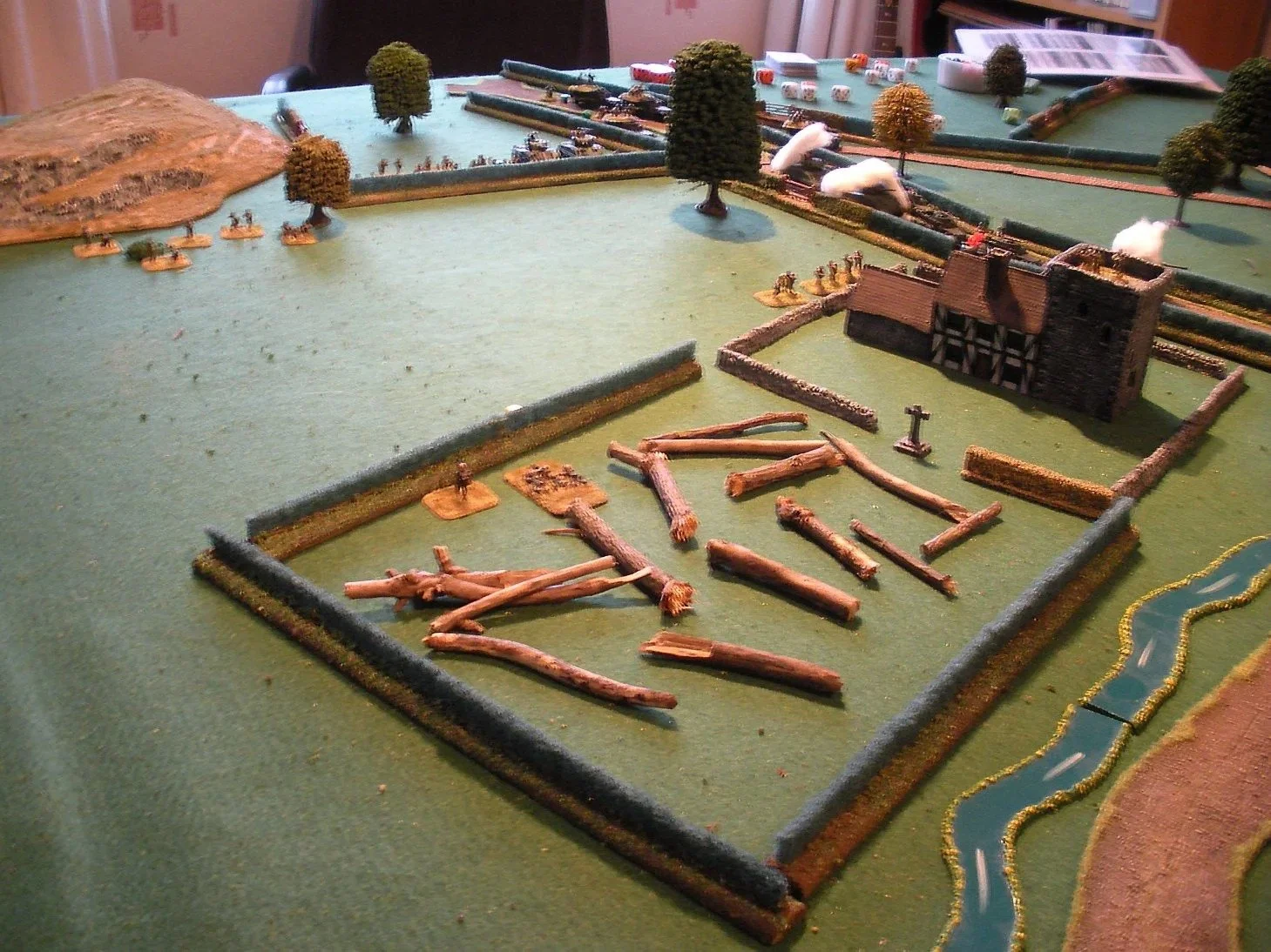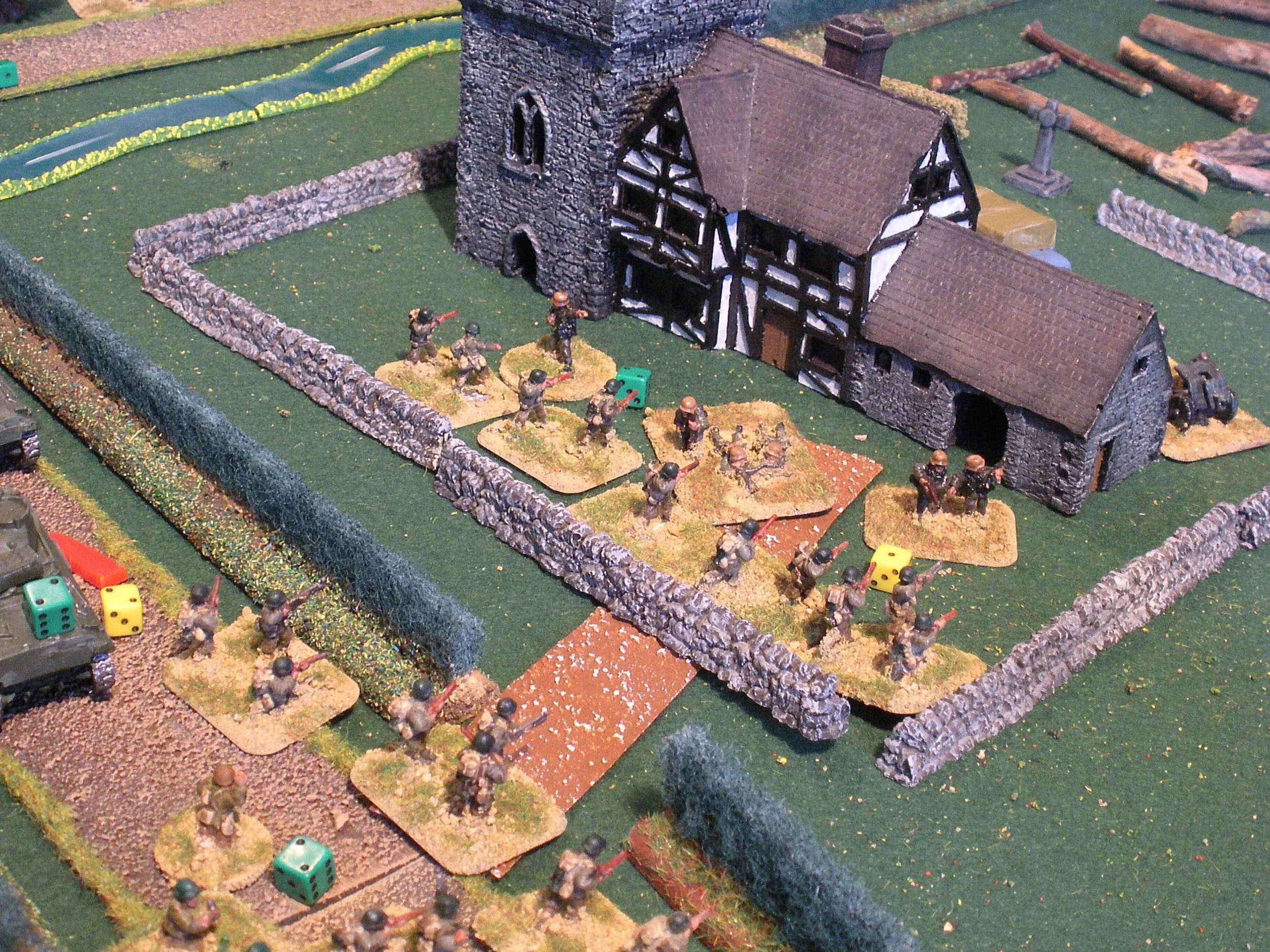 In the east at the other end of the table the Church was now in American hands and this allowed the 3rd Platoon to first shoot then manoeuvre slow across the very rough ground towards the Churchyard..