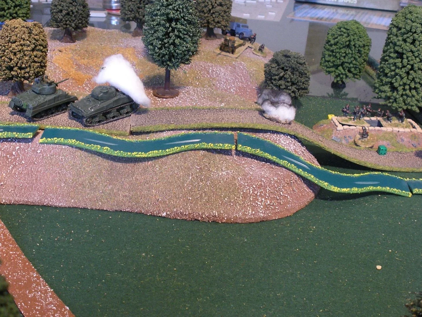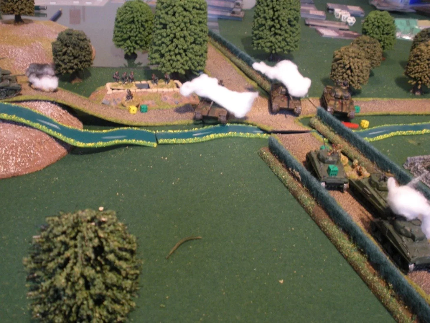 But wait this was before Lt. Tim Tulsa and his men in their 76mm Sherman decided they had had enough, and two shots later two Panthers were smoking like a good cigar. To top it all the fire also took out a machine gun nest and the Artillery Observer. You can see the Panthers smoking in the rear of the photo with the pseudo Sherman in front.