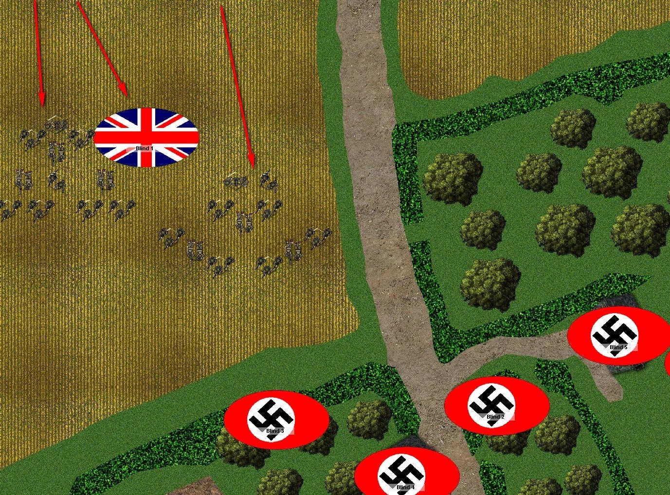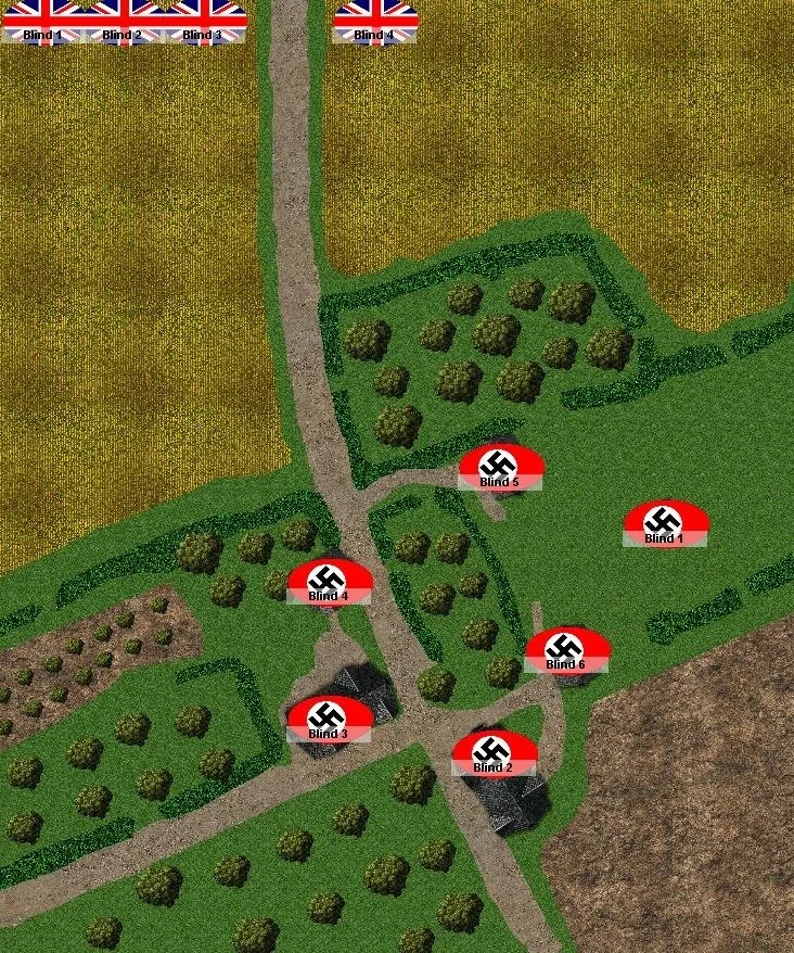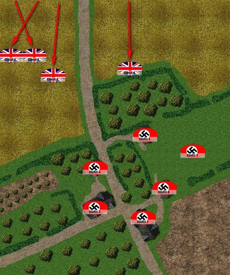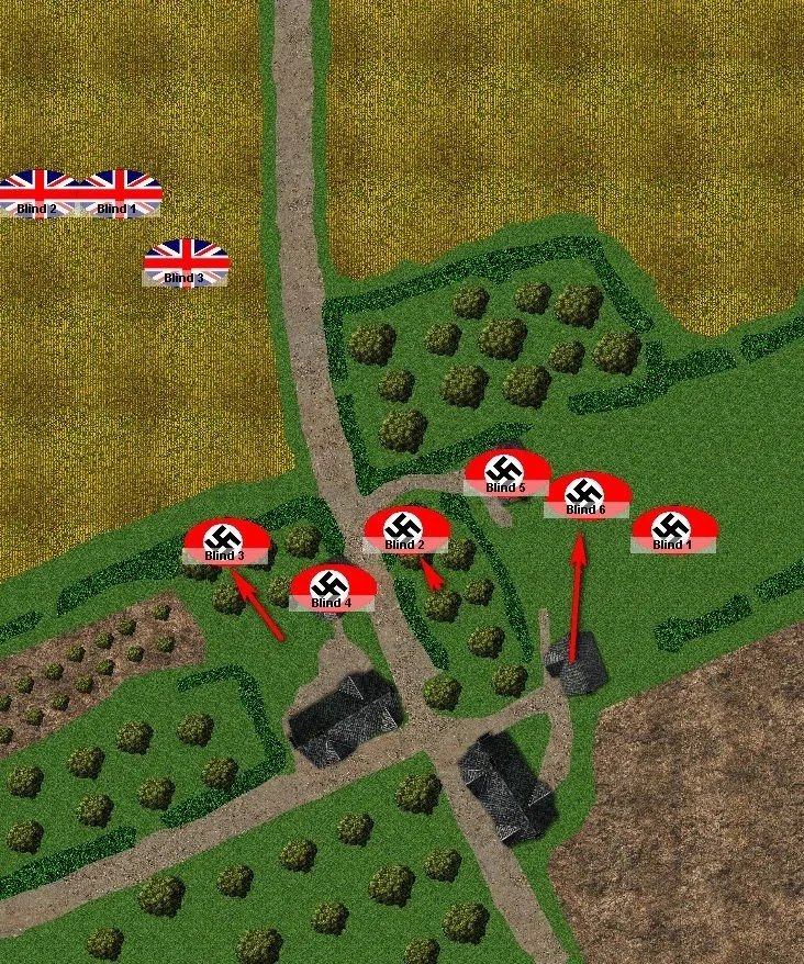 Now, some of the German Blinds can have a go at spotting my British blinds. That will make my movement slower, and allow the Germans to fire on my troops as I move in.