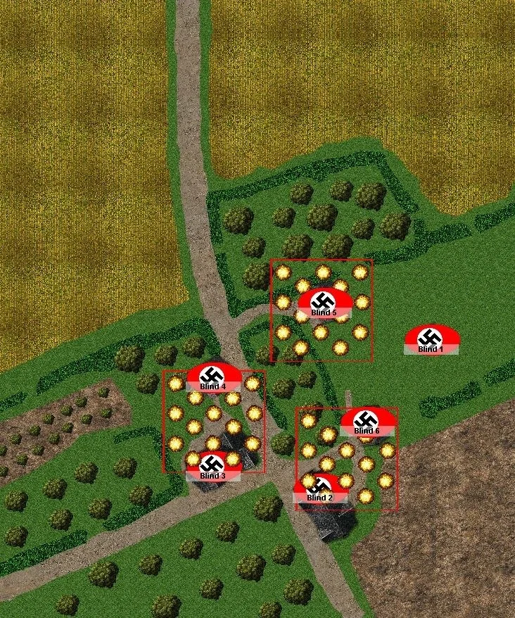 I would give the Germans three dummy blinds, plus the three they start with (good regulars would normally only get one dummy blind for three units on the table). I will then place these, fire the stonks, record the damage to each blind, and then reveal them as the game goes. In that manner, I won’t know where the German forces are, nor which ones I have damaged, until they actually appear on the table.