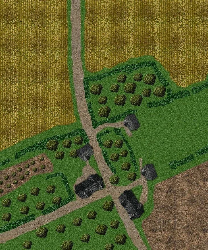 The table represents the flat open terrain to the north of Caen where the small hamlets and villages are the only features, clusters of buildings surrounded by their apple orchards. The wheat on the northern part of the table is high, standing at around 5’, so provides good cover from spotting. All of the areas of trees are apple orchards and have no undergrowth. The hedges are scrappy affairs with only small banks so provide only light cover. The buildings are well built of Norman stone and provide good cover. The ground is firm apart from in the freshly ploughed field at bottom right which has a -1 pip per dice on any movement.