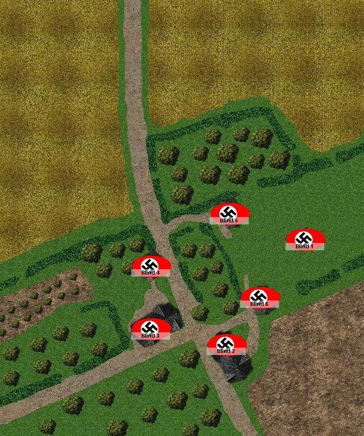 Axis Blinds is drawn. All German blinds recover a point of shock. German Blind 5 attempts to spot British Blind 4, but fails. German Blind 4 also attempts to spot British Blind 3, but also fails. The Tea Break then ends the turn.