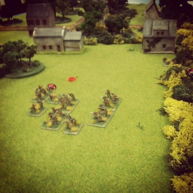 Midway through the field, the German rifles in the second barn spotted and revealed my blind, slowing their run and forcing them to deploy in the open. The final German blind revealed itself among the buildings west of the crossroads. My fresh British platoon hopped the hedges and likewise crossed to the west of the road, opening fire at the Germans in the building just the other side of a small orchard. Subsequent turns of fire were exchanged and my British losses started to pile up on my right.