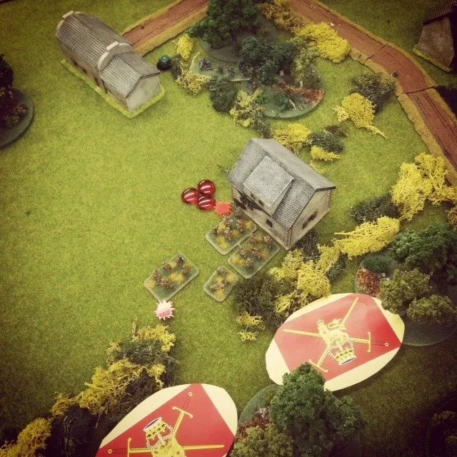 The small infantry engagement is set in the fictional hamlet of Le Moulin on a table of flat, open terrain with fields, orchards, low hedge rows and five stone buildings set at a crossroads. The game begins with three British infantry platoons entering from the north under blinds after an initial off-board artillery bombardment of the Germans dug under in around the farm and crossroads. The objective of the game is for the Germans to eliminate the British advance while the British are tasked with seizing four of the five buildings or otherwise eliminating the German troops.