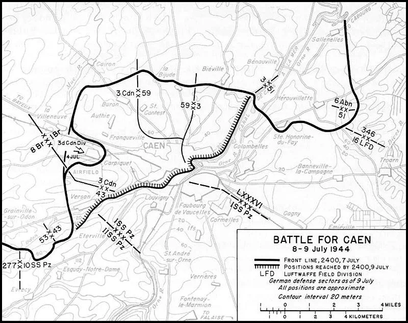 Over the next two months, the area around Caen became a bogged-down front as Anglo-Canadian forces positioned themselves around the city. The eventual capture of the city on August 6th was costly for all involved. The ancient city was nearly leveled with Allied bombing campaigns and much of the French civilian population fled. The British forces suffered around 50,000 casualties, a devastating loss of men and equipment for British commander Bernard Montgomery. With the costly British victory, it had achieved not only the occupation of Caen but had also provided an enormous distraction for German forces which suffered even greater losses than the Allies.
