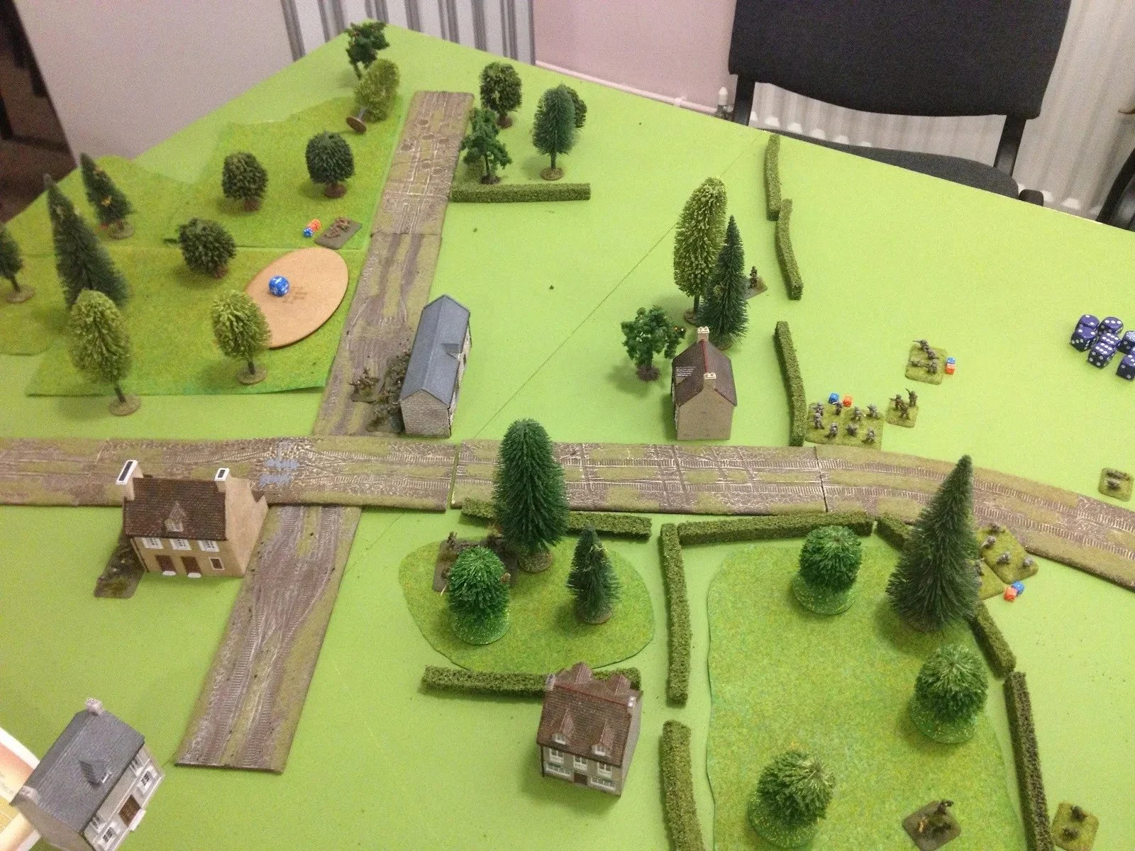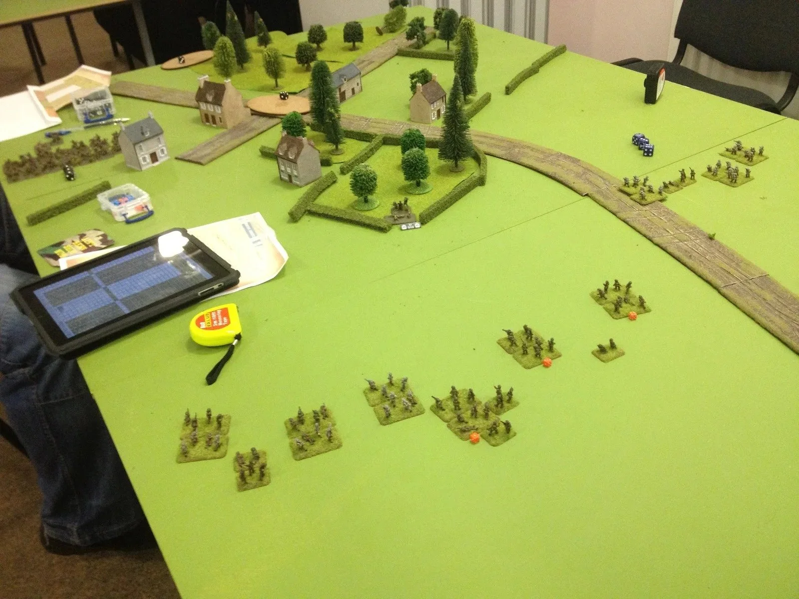 You will note the rules (on my iPad), Rueben's nice 15mm Germans and British (and please ignore the MG42 team's paint job, he says), and some custom made Warbases blinds markers, which I am very pleased with.