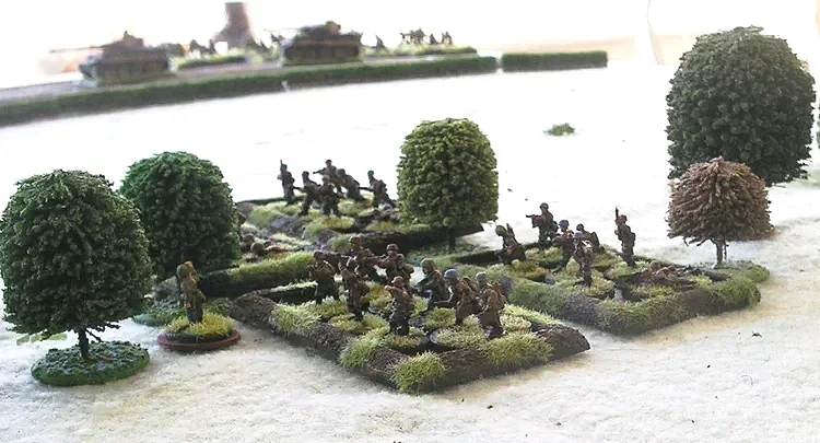 In the centre, the two infantry platoons also reached the end of the woods and headed up the slope, also taking a couple of casualties, this time from the howitzers who had decided to pretend the Tigers weren't really there!