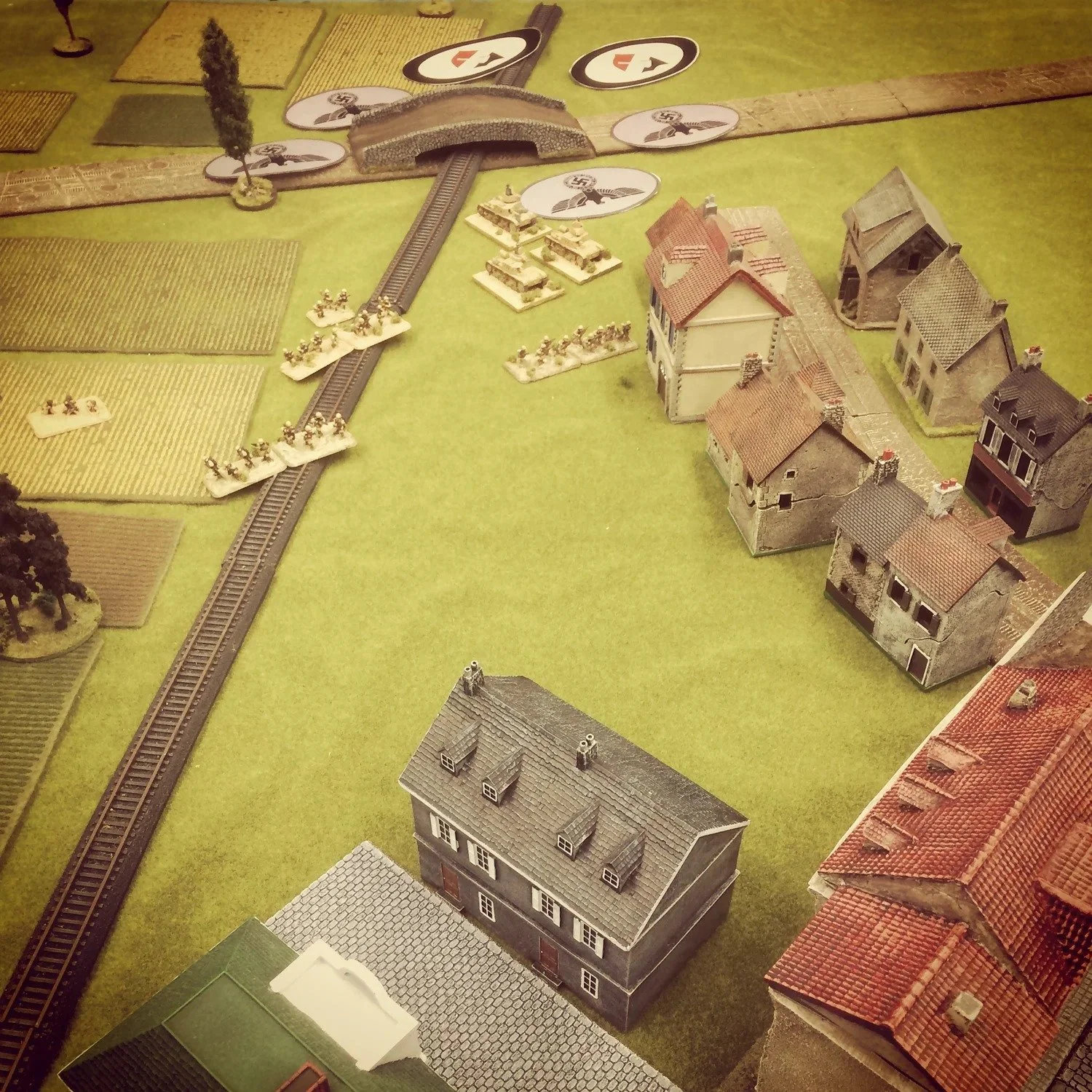 The Americans deployed in well-defended positions in the town with two platoons of rifles and light machine gun squads perched in buildings. A combat engineer platoon armed with a 37mm M3 anti-tank gun in tow sat hidden along the main street through town. Off board, 4.2 inch M2 mortars and 105 mm M2A1 howitzers from the 33rd Field Artillery Battalion were available as support to be called in by the captain from the company HQ perched in the tall building at the center of town. Tough and dug into great positions, the Americans looked to have a clear advantage.