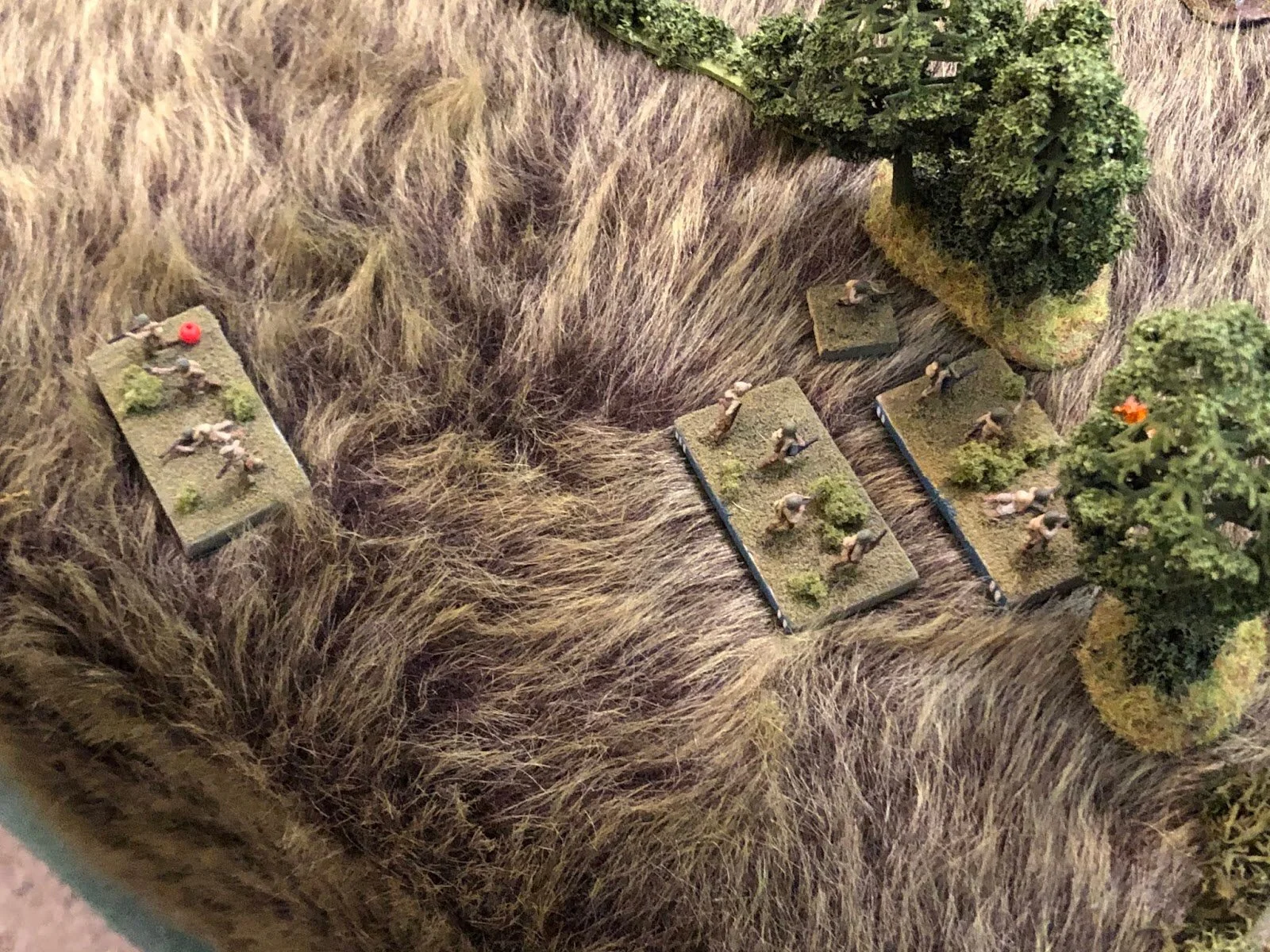 Their Lieutenant curses his cowardly comrades, but orders his 2nd Squad (bottom right) to lay down a base of fire as his 3rd Squad moves to envelop (far left).