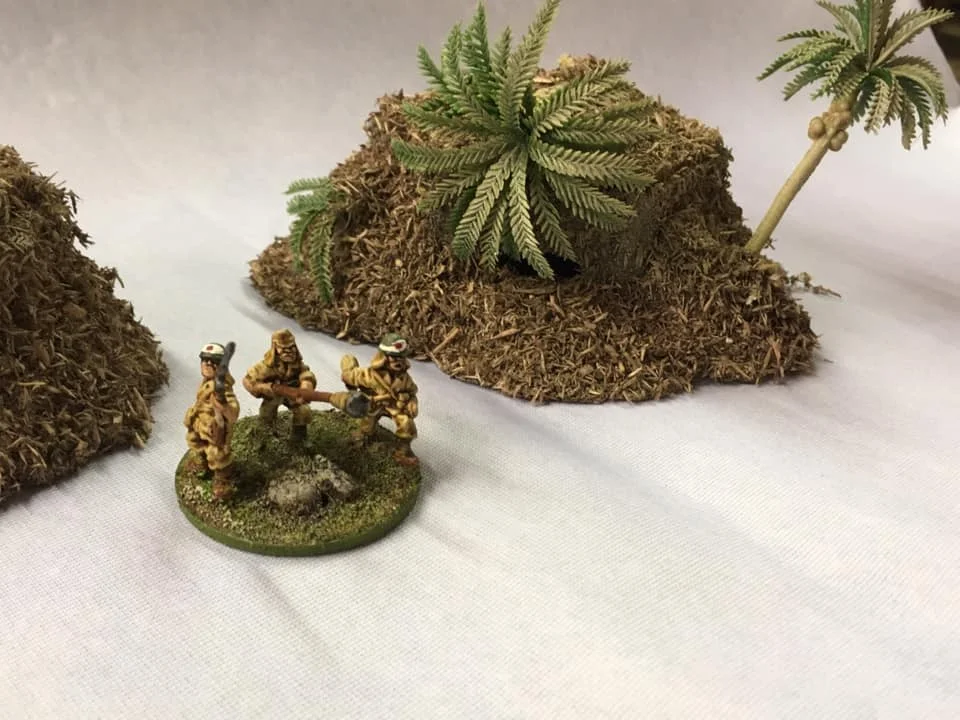 Japanese bunkers were constructed as follows: Barry Foster built the basic shape from a preformed craft box and covered it in Das clay. We then painted it with Sandtex paint and added some of our home made jungle floor mix.