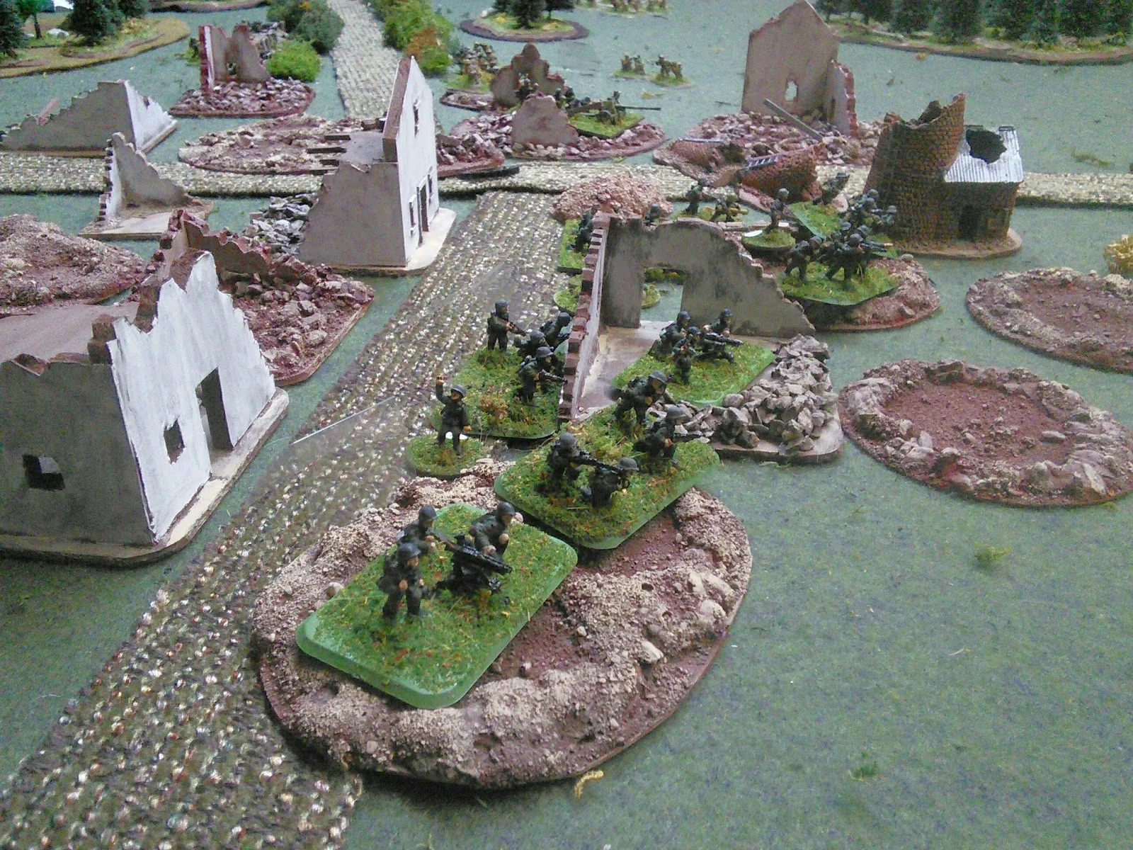 The Germans have two understrength platoons, a pair of Pak40 AT guns, plenty of MG42s and entrenchments plus my new Brummbärs. The Germans are hampered by "Ammo shortage" and "Breakdown" but they get the "Bonus MG Fire".
