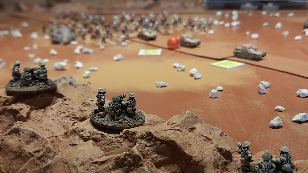 The only real danger I faced was the small tankettes with twin barreled LMGs. The anti tank rifles I had, couldn’t really make a dent in them. My only AT rifle team was gunned down in fact. Hence, on a “Heroic Leader” card my big man “Havilder Tin” picked up the Boys AT rifle and charged forward trying to put holes in the Italian tank. He was unfortunately very unlucky, and the LMGs dispatched him quickly afterwards.